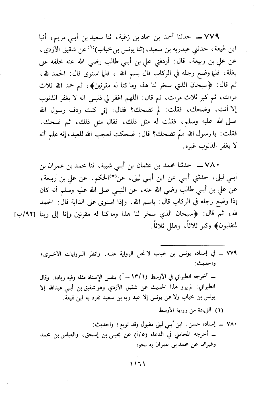 779- حَدَّثَنَا أَحْمَدُ بْنُ حَمَّادِ بْنِ زُغْبَةَ، حَدَّثَنَا سَعِيدُ بْنُ أَبِي مَرْيَمَ، أَخْبَرَنَا ابْنُ لَهِيعَةَ، حَدَّثَنِي عَبْدُ رَبِّهِ بْنُ سَعِيدٍ، (حَدَّثَنَا يُونُسُ بْنُ خَبَّابٍ)، عَنْ شَقِيقٍ الأَزْدِيِّ، عَنْ عَلِيِّ بْنِ رَبِيعَةَ، قَالَ: أَرْدَفَنِي عَلِيُّ بْنُ أَبِي طَالِبٍ رَضِيَ اللَّهُ عَنْهُ خَلْفَهُ عَلَى بَغْلَةٍ، فَلَمَّا وَضَعَ رِجْلَهُ فِي الرِّكَابِ قَالَ: بِسْمِ اللهِ، فَلَمَّا اسْتَوَى قَالَ: الْحَمْدُ لِلَّهِ، ثُمَّ قَالَ: {سُبْحَانَ الَّذِي سَخَّرَ لَنَا هَذَا وَمَا كُنَّا لَهُ مُقْرِنِينَ} ثُمَّ حَمِدَ اللَّهَ, ثَلاَثَ مَرَّاتٍ، ثُمَّ كَبَّرَ, ثَلاَثَ مَرَّاتٍ، ثُمَّ قَالَ: اللَّهُمَّ اغْفِرْ لِي ذَنْبِي, إِنَّهُ لاَ يَغْفِرُ الذُّنُوبَ إِلاَّ أَنْتَ، وَضَحِكَ، فَقُلْتُ: لِمَ تَضْحَكُ؟ فَقَالَ: إِنِّي كُنْتُ رِدْفَ رَسُولِ اللهِ صَلى الله عَلَيه وَسَلم, فَقُلْتُ لَهُ مِثْلَ ذَلِكَ، فَقَالَ مِثْلَ ذَلِكَ, ثُمَّ ضَحِكَ, فَقُلْتُ: يَا رَسُولَ اللهِ, مِمَّ تَضْحَكُ؟ قَالَ: ضَحِكْتُ لِعَجَبِ اللهِ لِلْعَبْدِ، إِنَّهُ عَلِمَ أَنَّهُ لاَ يَغْفِرُ الذُّنُوبَ غَيْرُهُ.