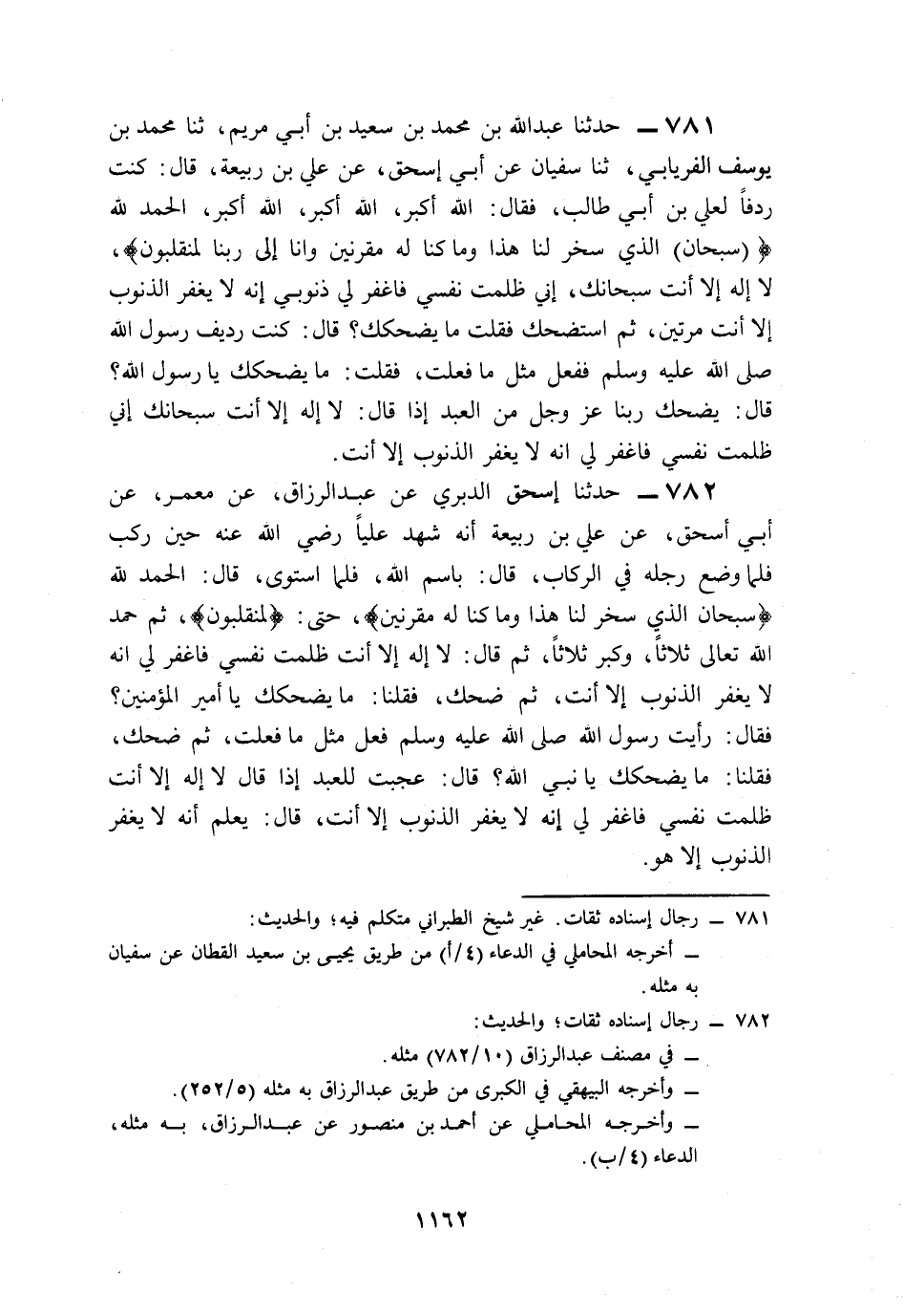 781- حَدَّثَنَا عَبْدُ اللهِ بْنُ مُحَمَّدِ بْنِ سَعِيدِ بْنِ أَبِي مَرْيَمَ، حَدَّثَنَا مُحَمَّدُ بْنُ يُوسُفَ الْفِرْيَابِيُّ، حَدَّثَنَا سُفْيَانُ، عَنْ أَبِي إِسْحَاقَ، عَنْ عَلِيِّ بْنِ رَبِيعَةَ، قَالَ: كُنْتُ رِدْفًا لِعَلِيِّ بْنِ أَبِي طَالِبٍ فَقَالَ: اللَّهُ أَكْبَرُ، اللَّهُ أَكْبَرُ، اللَّهُ أَكْبَرُ، الْحَمْدُ لِلَّهِ: {سُبْحَانَ الَّذِي سَخَّرَ لَنَا هَذَا وَمَا كُنَّا لَهُ مُقْرِنِينَ وَإِنَّا إِلَى رَبِّنَا لَمُنْقَلِبُونَ} لاَ إِلَهَ إِلاَّ أَنْتَ سُبْحَانَكَ إِنِّي ظَلَمْتُ نَفْسِي, فَاغْفِرْ لِي ذُنُوبِي, إِنَّهُ لاَ يَغْفِرُ الذُّنُوبَ إِلاَّ أَنْتَ، مَرَّتَيْنِ, ثُمَّ اسْتَضْحَكَ، فَقُلْتُ: مَا يُضْحِكُكَ؟ قَالَ: كُنْتُ رَدِيفَ رَسُولِ اللهِ صَلى الله عَلَيه وَسَلم, فَفَعَلَ مِثْلَ مَا فَعَلْتُ، فَقُلْتُ: مَا يُضْحِكُكَ يَا رَسُولَ اللهِ؟ قَالَ: يَضْحَكُ رَبُّنَا عَزَّ وَجَلَّ مِنَ الْعَبْدِ إِذَا قَالَ: لاَ إِلَهَ إِلاَّ أَنْتَ سُبْحَانَكَ إِنِّي ظَلَمْتُ نَفْسِي فَاغْفِرْ لِي, إِنَّهُ لاَ يَغْفِرُ الذُّنُوبَ إِلاَّ أَنْتَ.