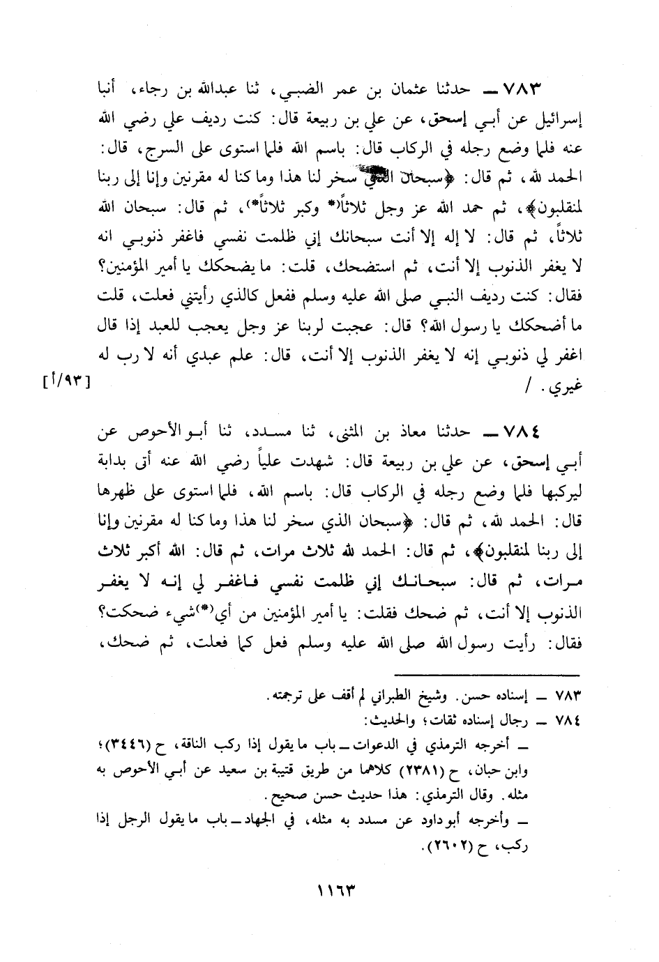 783- حَدَّثَنَا عُثْمَانُ بْنُ عُمَرَ الضَّبِّيُّ، حَدَّثَنَا عَبْدُ اللهِ بْنُ رَجَاءٍ، أَخْبَرَنَا إِسْرَائِيلُ، عَنْ أَبِي إِسْحَاقَ، عَنْ عَلِيِّ بْنِ رَبِيعَةَ، قَالَ: كُنْتُ رَدِيفَ عَلِيٍّ رَضِيَ اللَّهُ عَنْهُ, فَلَمَّا وَضَعَ رِجْلَهُ فِي الرِّكَابِ قَالَ: بِاسْمِ اللهِ، فَلَمَّا اسْتَوَى عَلَى السُّرُجِ، قَالَ: الْحَمْدُ لِلَّهِ، ثُمَّ قَالَ: {سُبْحَانَ الَّذِي سَخَّرَ لَنَا هَذَا وَمَا كُنَّا لَهُ مُقْرِنِينَ وَإِنَّا إِلَى رَبِّنَا لَمُنْقَلِبُونَ} ثُمَّ حَمِدَ اللَّهَ عَزَّ وَجَلَّ ثَلاَثًا، وَكَبَّرَ ثَلاَثًا، ثُمَّ قَالَ: سُبْحَانَ اللهِ ثَلاَثًا، ثُمَّ قَالَ: لاَ إِلَهَ إِلاَّ أَنْتَ سُبْحَانَكَ إِنِّي ظَلَمْتُ نَفْسِي, فَاغْفِرْ ذُنُوبِي, إِنَّهُ لاَ يَغْفِرُ الذُّنُوبَ إِلاَّ أَنْتَ، ثُمَّ اسْتَضْحَكَ، قُلْتُ: مَا يُضْحِكُكَ يَا أَمِيرَ الْمُؤْمِنِينَ؟ فَقَالَ: كُنْتُ رَدِيفَ النَّبِيِّ صَلى الله عَلَيه وَسَلم, فَفَعَلَ كَالَّذِي رَأَيْتَنِي فَعَلْتُ، قُلْتُ: مَا أَضْحَكَكَ يَا رَسُولَ اللهِ؟ قَالَ: عَجِبْتُ لِرَبِّنَا عَزَّ وَجَلَّ, يَعْجَبُ لِلْعَبْدِ إِذَا قَالَ: اغْفِرْ لِي ذُنُوبِي, إِنَّهُ لاَ يَغْفِرُ الذُّنُوبَ إِلاَّ أَنْتَ، قَالَ: عَلِمَ عَبْدِي أَنَّهُ لاَ رَبَّ لَهُ غَيْرِي.