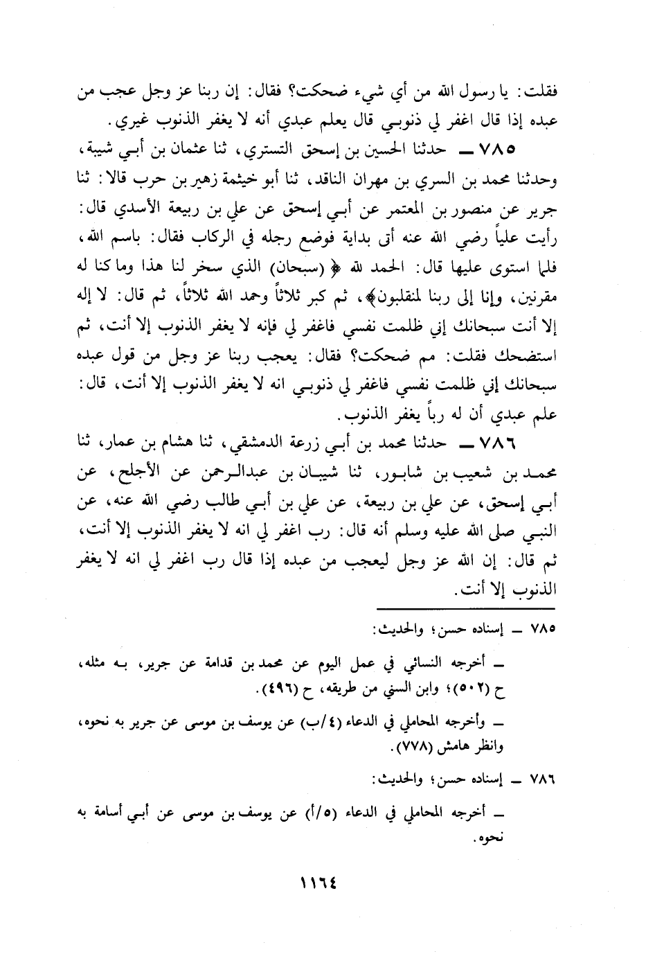 786- حَدَّثَنَا مُحَمَّدُ بْنُ أَبِي زُرْعَةَ الدِّمَشْقِيُّ، حَدَّثَنَا هِشَامُ بْنُ عَمَّارٍ، حَدَّثَنَا مُحَمَّدُ بْنُ شُعَيْبِ بْنِ شَابُورَ، حَدَّثَنَا شَيْبَانُ بْنُ عَبْدِ الرَّحْمَنِ، عَنِ الأَجْلَحِ، عَنْ أَبِي إِسْحَاقَ، عَنْ عَلِيِّ بْنِ رَبِيعَةَ، عَنْ عَلِيِ بْنِ أَبِي طَالِبٍ، رَضِيَ اللَّهُ عَنْهُ, عَنِ النَّبِيِّ صَلى الله عَلَيه وَسَلم أَنَّهُ قَالَ: رَبِّ اغْفِرْ لِي, إِنَّهُ لاَ يَغْفِرُ الذُّنُوبَ إِلاَّ أَنْتَ, ثُمَّ قَالَ: إِنَّ اللَّهَ عَزَّ وَجَلَّ لَيَعْجَبُ مِنْ عَبْدِهِ إِذَا قَالَ: رَبِّ اغْفِرْ لِي, إِنَّهُ لاَ يَغْفِرُ الذُّنُوبَ إِلاَّ أَنْتَ.