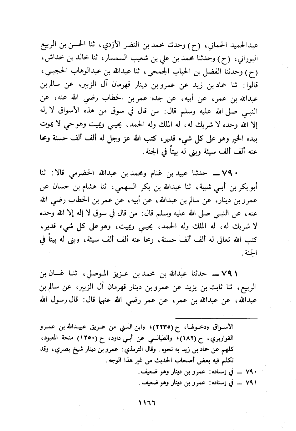 790- حَدَّثَنَا عُبَيْدُ بْنُ غَنَّامٍ، وَمُحَمَّدُ بْنُ عَبْدِ اللهِ الْحَضْرَمِيُّ، قَالاَ: حَدَّثَنَا أَبُو بَكْرِ بْنُ أَبِي شَيْبَةَ، حَدَّثَنَا عَبْدُ اللهِ بْنُ بَكْرٍ السَّهْمِيُّ، حَدَّثَنَا هِشَامُ بْنُ حَسَّانَ، عَنْ عَمْرِو بْنِ دِينَارٍ، عَنْ سَالِمِ بْنِ عَبْدِ اللهِ، عَنْ أَبِيهِ، عَنْ عُمَرَ بْنِ الْخَطَّابِ، رَضِيَ اللَّهُ عَنْهُ, عَنِ النَّبِيِّ صَلى الله عَلَيه وَسَلم قَالَ: مَنْ قَالَ فِي سُوقٍ: لاَ إِلَهَ إِلاَّ اللَّهُ وَحْدَهُ لاَ شَرِيكَ لَهُ، لَهُ الْمُلْكُ وَلَهُ الْحَمْدُ، يُحْيِي وَيُمِيتُ, وَهُوَ عَلَى كُلِّ شَيْءٍ قَدِيرٌ، كَتَبَ اللَّهُ تَعَالَى لَهُ أَلْفَ أَلْفِ حَسَنَةً، وَمَحَا عَنْهُ أَلْفَ أَلْفِ سَيِّئَةً، وَبَنَى لَهُ بَيْتًا فِي الْجَنَّةِ.