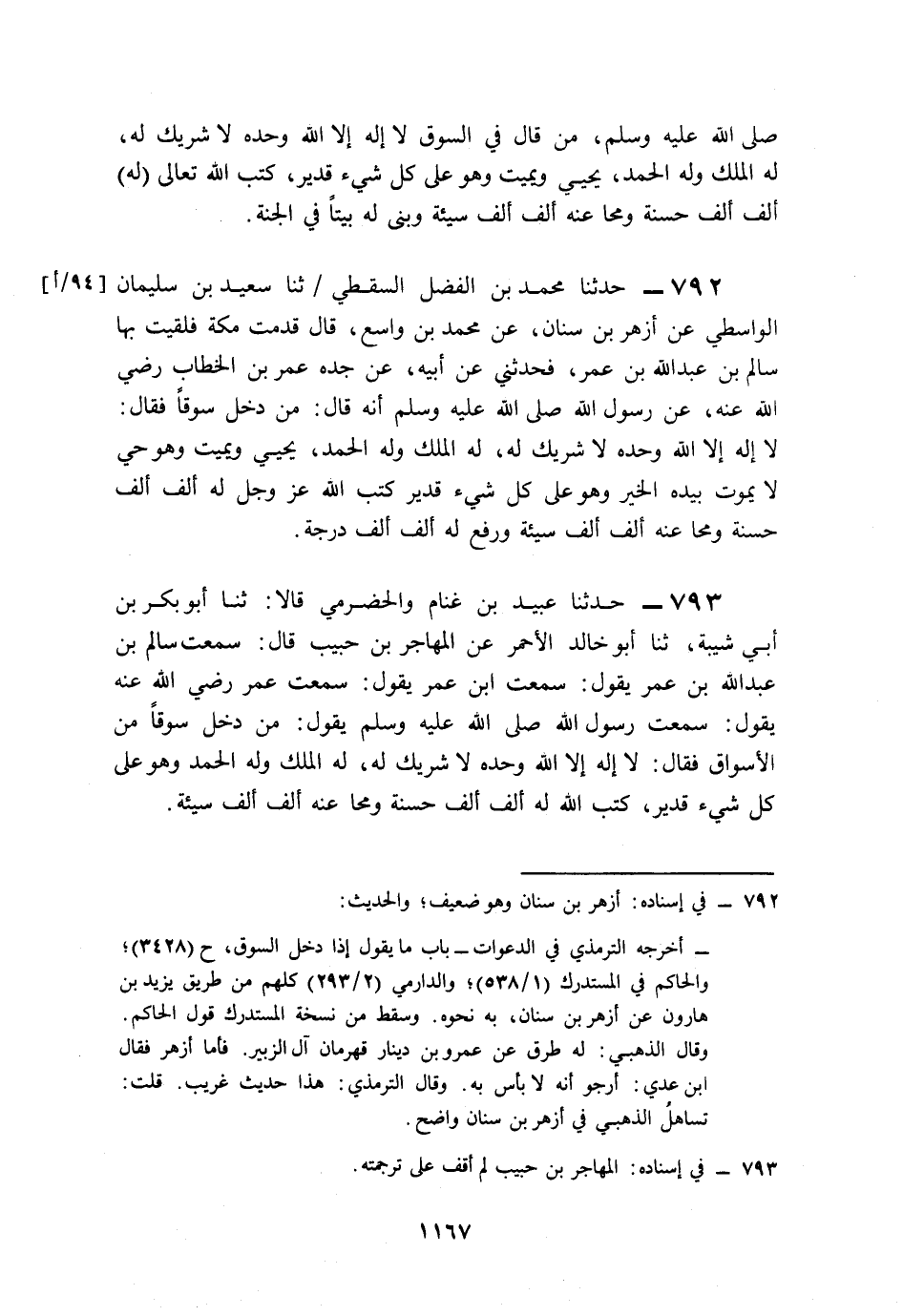 792- حَدَّثَنَا مُحَمَّدُ بْنُ الْفَضْلِ السَّقَطِيُّ، حَدَّثَنَا سَعِيدُ بْنُ سُلَيْمَانَ الْوَاسِطِيُّ، عَنْ أَزْهَرَ بْنِ سِنَانٍ، عَنْ مُحَمَّدِ بْنِ وَاسِعٍ، قَالَ: قَدِمْتُ مَكَّةَ فَلَقِيتُ بِهَا سَالِمَ بْنَ عَبْدِ اللهِ بْنِ عُمَرَ، فَحَدَّثَنِي عَنُ أَبِيهِ, عَنْ جَدِّهِ عُمَرَ بْنِ الْخَطَّابِ رَضِيَ اللَّهُ عَنْهُ, عَنْ رَسُولِ اللهِ صَلى الله عَلَيه وَسَلم أَنَّهُ قَالَ: مَنْ دَخَلَ سُوقًا فَقَالَ: لاَ إِلَهَ إِلاَّ اللَّهُ وَحْدَهُ لاَ شَرِيكَ لَهُ، لَهُ الْمُلْكُ وَلَهُ الْحَمْدُ يُحْيِي وَيُمِيتُ, وَهُوَ حَيُّ لاَ يَمُوتُ، بِيَدِهِ الْخَيْرُ, وَهُوَ عَلَى كُلِّ شَيْءٍ قَدِيرٌ، كَتَبَ اللَّهُ عَزَّ وَجَلَّ لَهُ أَلْفَ أَلْفِ حَسَنَةً، وَمَحَا عَنْهُ أَلْفَ أَلْفِ سَيِّئَةً، وَرَفَعَ لَهُ أَلْفَ أَلْفِ دَرَجَةً.