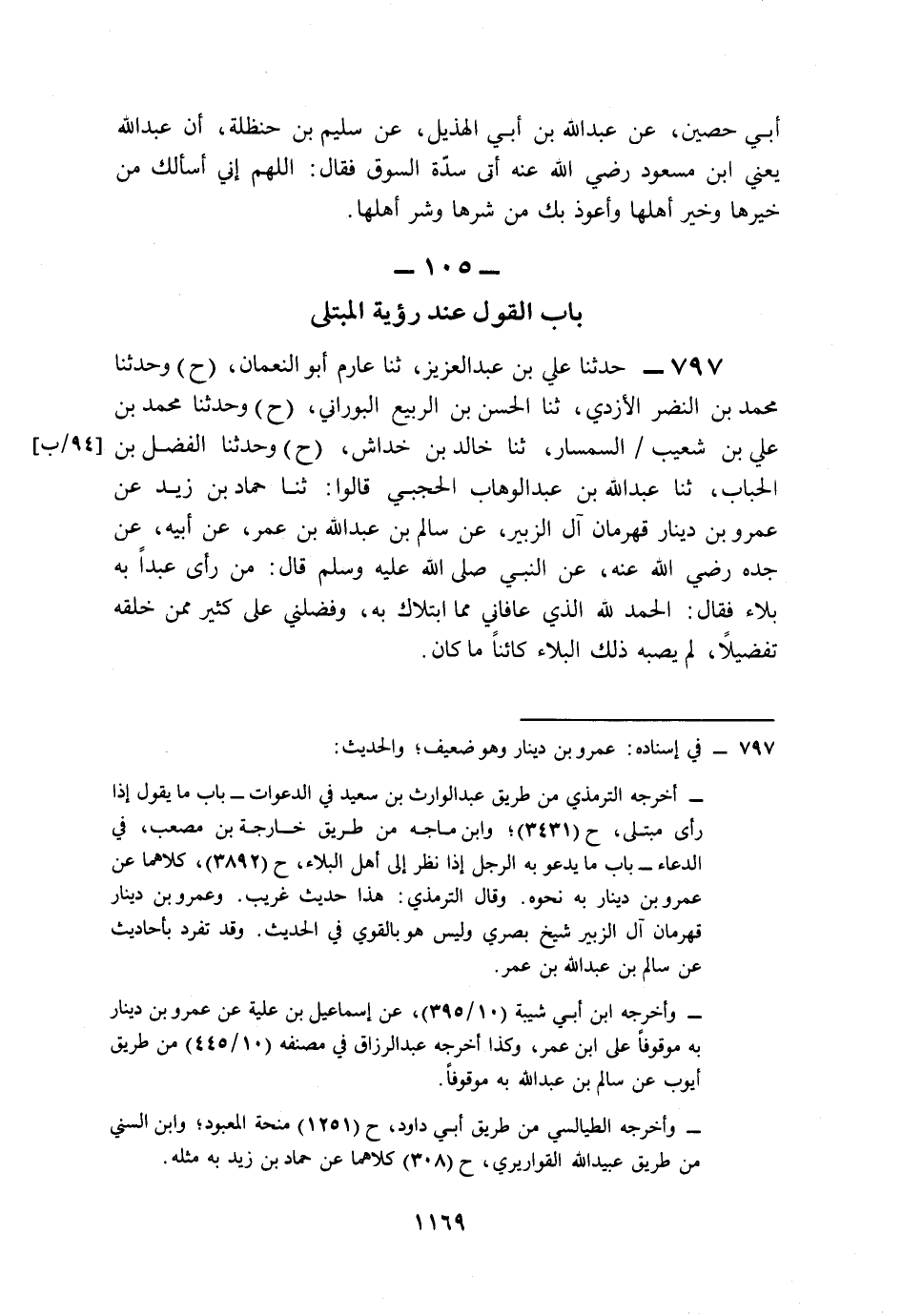 797- حَدَّثَنَا عَلِيُّ بْنُ عَبْدِ الْعَزِيزِ، حَدَّثَنَا عَارِمٌ, أَبُو النُّعْمَانِ (ح) وَحَدَّثَنَا مُحَمَّدُ بْنُ النَّضْرِ الأَزْدِيُّ، حَدَّثَنَا الْحَسَنُ بْنُ الرَّبِيعِ الْبُورَانِيُّ (ح) وَحَدَّثَنَا مُحَمَّدُ بْنُ عَلِيِّ بْنِ شُعَيْبٍ السِّمْسَارُ، حَدَّثَنَا خَالِدُ بْنُ خِدَاشٍ (ح) وَحَدَّثَنَا الْفَضْلُ بْنُ الْحُبَابِ، حَدَّثَنَا عَبْدُ اللهِ بْنُ عَبْدِ الْوَهَّابِ الْحَجَبِيُّ، قَالُوا: حَدَّثَنَا حَمَّادُ بْنُ زَيْدٍ، عَنْ عَمْرِو بْنِ دِينَارٍ, قَهْرَمَانِ آلِ الزُّبَيْرِ، عَنْ سَالِمِ بْنِ عَبْدِ اللهِ بْنِ عُمَرَ، عَنْ أَبِيهِ، عَنْ جَدِّهِ، رَضِيَ اللَّهُ عَنْهُ, عَنِ النَّبِيِّ صَلى الله عَلَيه وَسَلم قَالَ: مَنْ رَأَى عَبْدًا بِهِ بَلاَءٌ فَقَالَ: الْحَمْدُ لِلَّهِ الَّذِي عَافَانِي مِمَّا ابْتَلاَكَ بِهِ, وَفَضَّلَنِي عَلَى كَثِيرٍ مِمَّنْ خَلَقَهُ تَفْضِيلاً, لَمْ يُصِبْهُ ذَلِكَ الْبَلاَءُ, كَائِنًا مَا كَانَ.