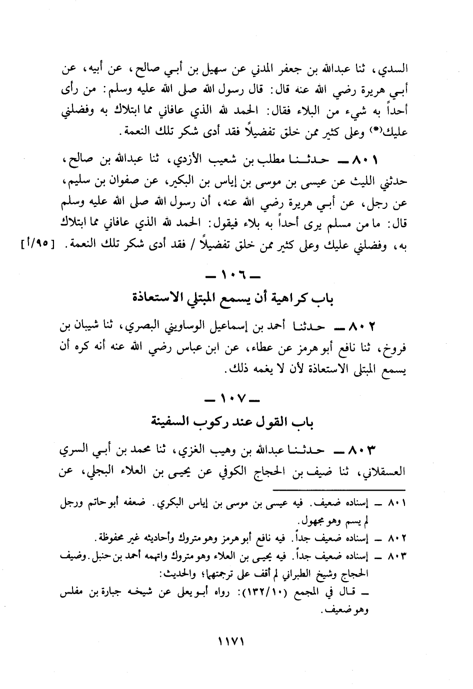 801- حَدَّثَنَا مُطَّلِبُ بْنُ شُعَيْبٍ الأَزْدِيُّ، حَدَّثَنَا عَبْدُ اللهِ بْنُ صَالِحٍ، حَدَّثَنِي اللَّيْثُ، عَنْ عِيسَى بْنِ مُوسَى بْنِ إِيَاسِ بْنِ الْبُكَيْرِ، عَنْ صَفْوَانَ بْنِ سُلَيْمٍ، عَنْ رَجُلٍ، عَنْ أَبِي هُرَيْرَةَ، رَضِيَ اللَّهُ عَنْهُ, أَنَّ رَسُولَ اللهِ صَلى الله عَلَيه وَسَلم قَالَ: مَا مِنْ مُسْلِمٍ يَرَى أَحَدًا بِهِ بَلاَءٌ فَيَقُولُ: الْحَمْدُ لِلَّهِ الَّذِي عَافَانِي مِمَّا ابْتَلاَكَ بِهِ، وَفَضَّلَنِي عَلَيْكَ وَعَلَى كَثِيرٍ مِمَّنْ خَلَقَ تَفْضِيلاً, فَقَدْ أَدَّى شُكْرَ تِلْكَ النِّعْمَةِ.