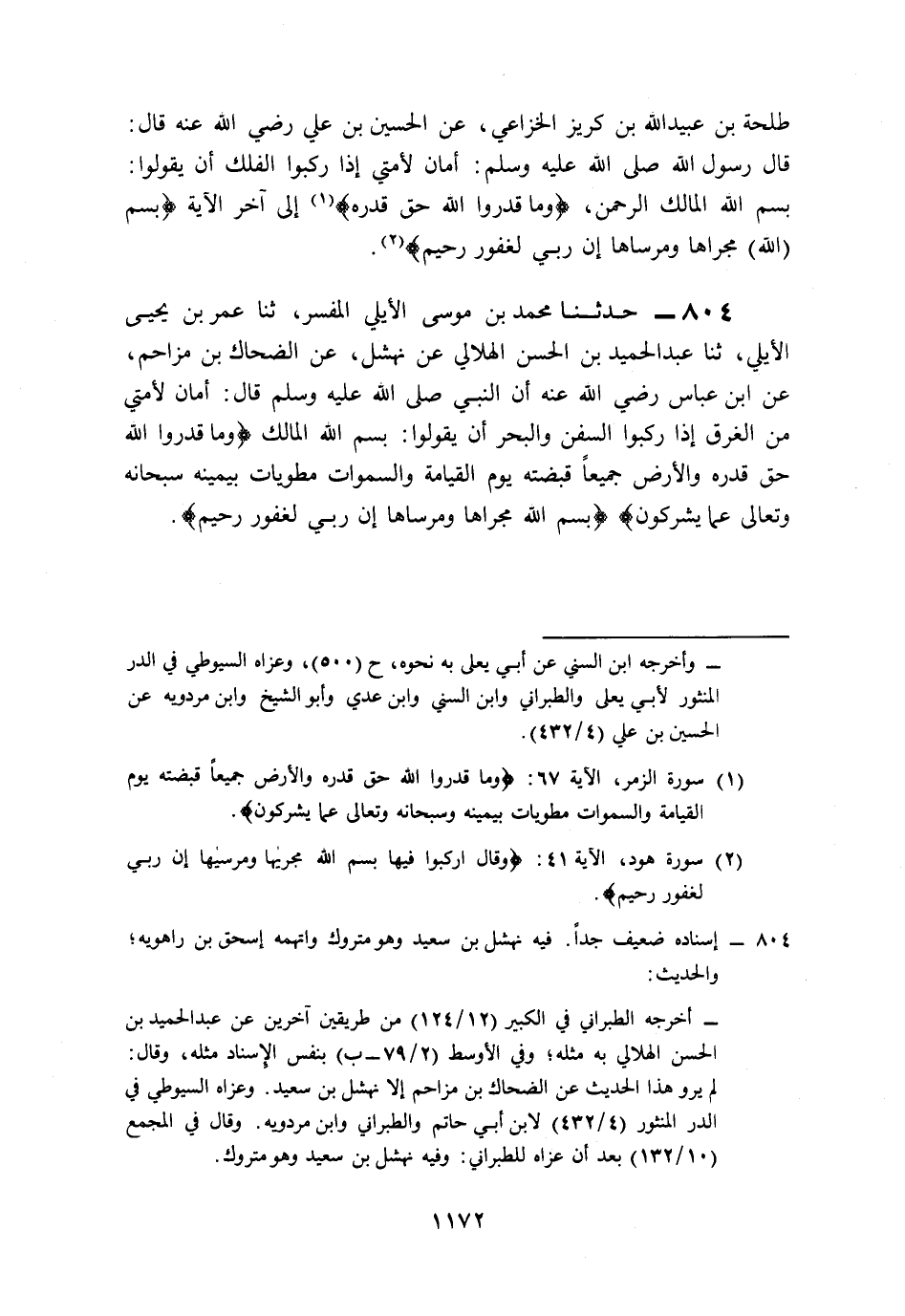 804- حَدَّثَنَا مُحَمَّدُ بْنُ مُوسَى الأَيْلِيُّ الْمُفَسِّرُ، حَدَّثَنَا عُمَرُ بْنُ يَحْيَى الأَيْلِيُّ، حَدَّثَنَا عَبْدُ الْحَمِيدِ بْنُ الْحَسَنِ الْهِلاَلِيُّ، عَنْ نَهْشَلٍ، عَنِ الضَّحَّاكِ بْنِ مُزَاحِمٍ، عَنِ ابْنِ عَبَّاسٍ، رَضِيَ اللَّهُ عَنْهُ, أَنَّ النَّبِيَّ صَلى الله عَلَيه وَسَلم قَالَ: أَمَانٌ لِأُمَّتِي مِنَ الْغَرَقِ إِذَا رَكِبُوا السُّفُنَ وَالْبَحْرَ أَنْ يَقُولُوا: بِسْمِ اللهِ الْمَالِكِ: {وَمَا قَدَرُوا اللَّهَ حَقَّ قَدْرِهِ وَالأَرْضُ جَمِيعًا قَبْضَتُهُ يَوْمَ الْقِيَامَةِ وَالسَّمَوَاتُ مَطْوِيَّاتٌ بِيَمِينِهِ سُبْحَانَهُ وَتَعَالَى عَمَّا يُشْرِكُونَ}, {بِسْمِ اللهِ مَجْرَاهَا وَمُرْسَاهَا إِنَّ رَبِّي لَغَفُورٌ رَحِيمٌ}.
