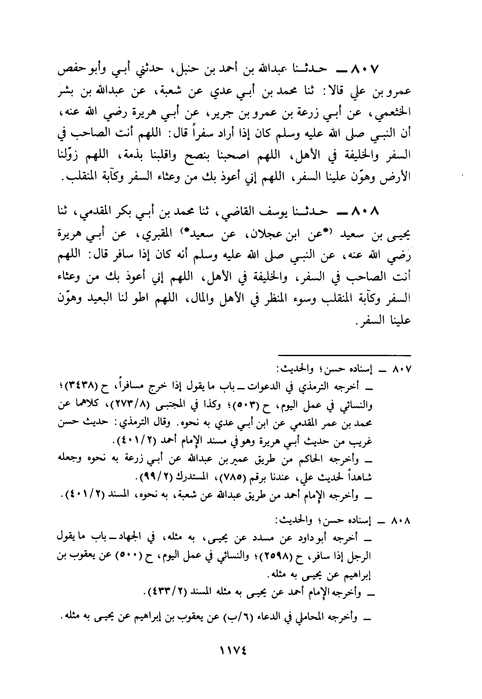 807- حَدَّثَنَا عَبْدُ اللهِ بْنُ أَحْمَدَ بْنِ حَنْبَلٍ، حَدَّثَنِي أَبِي, وَأَبُو حَفْصٍ عَمْرُو بْنُ عَلِيٍّ قَالاَ: حَدَّثَنَا مُحَمَّدُ بْنُ أَبِي عَدِيٍّ، عَنْ شُعْبَةَ، عَنْ عَبْدِ اللهِ بْنِ بِشْرٍ الْخَثْعَمِيِّ، عَنْ أَبِي زُرْعَةَ بْنِ عَمْرِو بْنِ جَرِيرٍ، عَنْ أَبِي هُرَيْرَةَ، رَضِيَ اللَّهُ عَنْهُ, أَنَّ النَّبِيَّ صَلى الله عَلَيه وَسَلم كَانَ إِذَا أَرَادَ سَفَرًا قَالَ: اللَّهُمَّ أَنْتَ الصَّاحِبُ فِي السَّفَرِ، وَالْخَلِيفَةُ فِي الأَهْلِ، اللَّهُمَّ اصْحَبْنَا بِنُصْحٍ، وَاقْلِبْنَا بِذِمَّةٍ، اللَّهُمَّ زَوِّ لَنَا الأَرْضَ، وَهَوِّنْ عَلَيْنَا السَّفَرَ، اللَّهُمَّ إِنِّي أَعُوذُ بِكَ مِنْ وَعْثَاءِ السَّفَرِ, وَكَآبَةِ الْمُنْقَلَبِ.