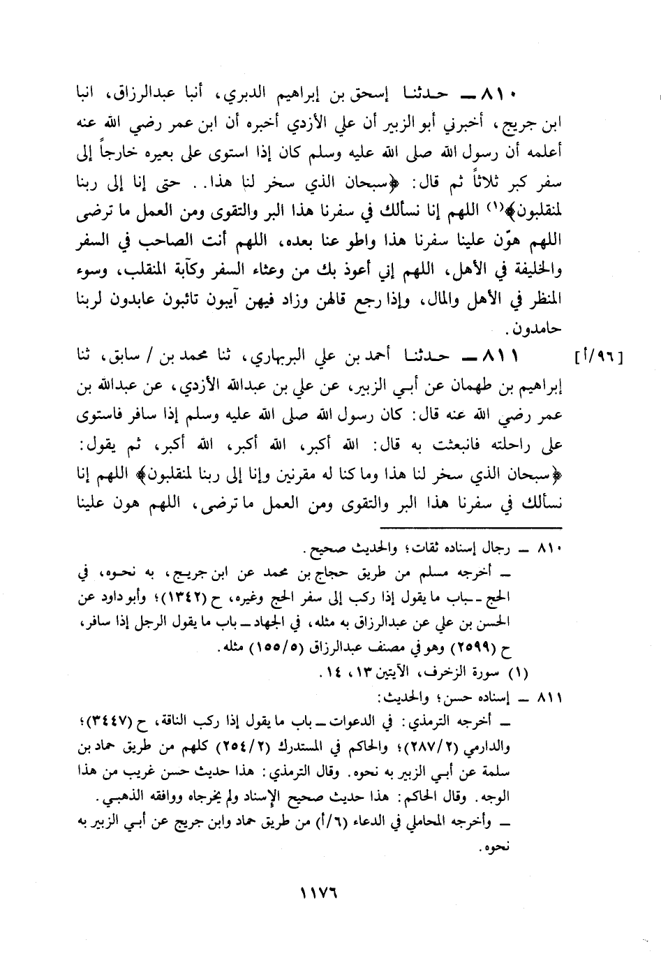 810- حَدَّثَنَا إِسْحَاقُ بْنُ إِبْرَاهِيمَ الدَّبَرِيُّ، أَخْبَرَنَا عَبْدُ الرَّزَّاقِ، أَخْبَرَنَا ابْنُ جُرَيْجٍ، أَخْبَرَنِي أَبُو الزُّبَيْرِ، أَنَّ عَلِيّ الأَزْدِيَّ أَخْبَرَهُ, أَنَّ ابْنَ عُمَرَ رَضِيَ اللَّهُ عَنْهُ أَعْلَمَهُ, أَنَّ رَسُولَ اللهِ صَلى الله عَلَيه وَسَلم كَانَ إِذَا اسْتَوَى عَلَى بَعِيرِهِ خَارِجًا إِلَى سَفَرٍ, كَبَّرَ ثَلاَثًا، ثُمَّ قَالَ: {سُبْحَانَ الَّذِي سَخَّرَ لَنَا هَذَا} حَتَّى: إِنَّا إِلَى رَبِّنَا لَمُنْقَلِبُونَ, اللَّهُمَّ إِنَّا نَسْأَلُكَ فِي سَفَرِنَا هَذَا الْبِرَّ وَالتَّقْوَى، وَمِنَ الْعَمَلِ مَا تَرْضَى، اللَّهُمَّ هَوِّنْ عَلَيْنَا سَفَرَنَا هَذَا، وَاطْوِ عَنَّا بُعْدَهُ، اللَّهُمَّ أَنْتَ الصَّاحِبُ فِي السَّفَرِ، وَالْخَلِيفَةُ فِي الأَهْلِ، اللَّهُمَّ إِنِّي أَعُوذُ بِكَ مِنْ وَعْثَاءِ السَّفَرِ, وَكَآبَةِ الْمُنْقَلَبِ، وَسُوءِ الْمَنْظَرِ فِي الأَهْلِ وَالْمَالِ, وَإِذَا رَجَعَ قَالَهُنَّ, وَزَادَ فِيهِنَّ: آيِبُونَ تَائِبُونَ عَابِدُونَ, لِرَبِّنَا حَامِدُونَ.