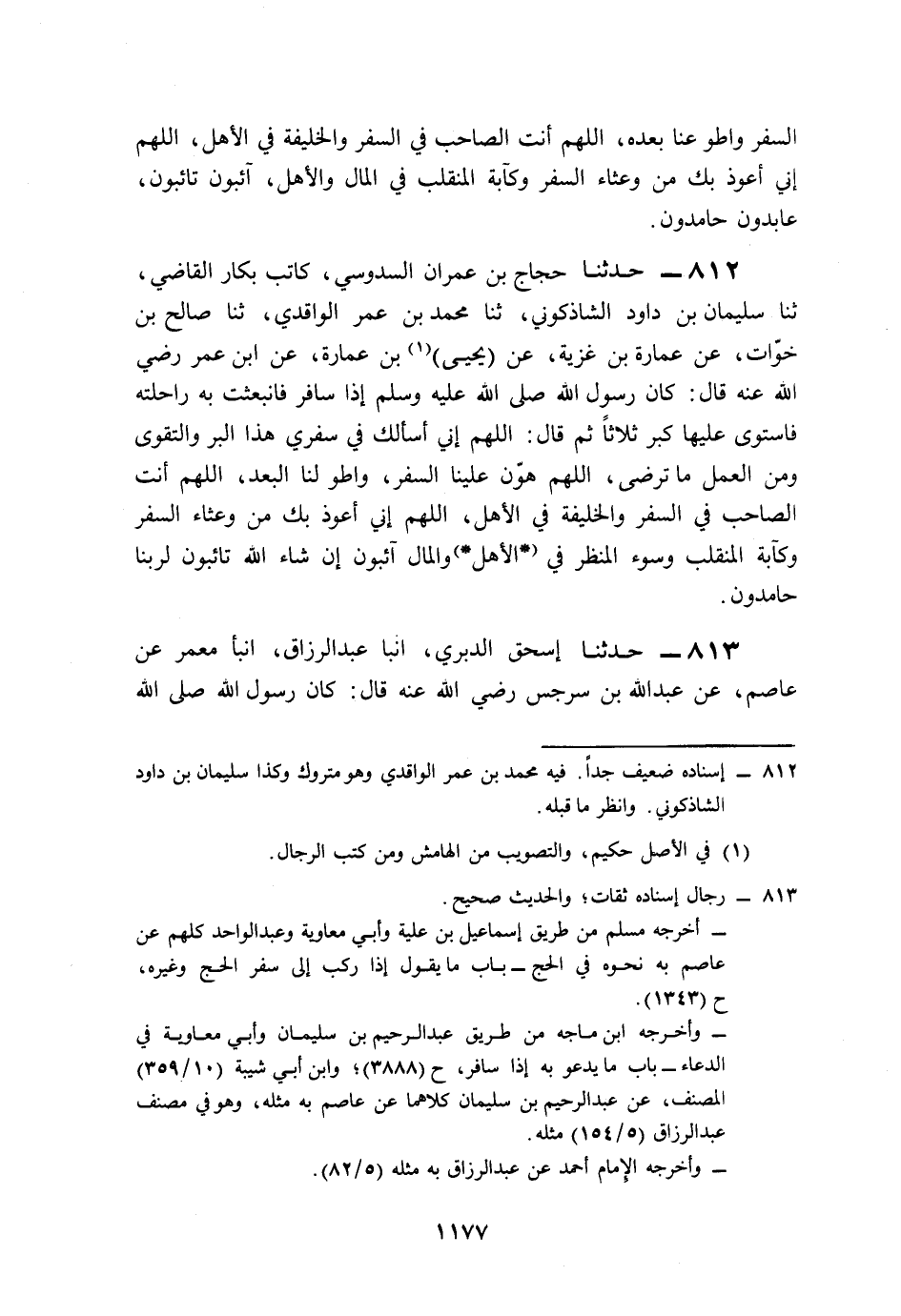 812- حَدَّثَنَا حَجَّاجُ بْنُ عِمْرَانَ السَّدُوسِيُّ, كَاتِبُ بَكَّارٍ الْقَاضِي، حَدَّثَنَا سُلَيْمَانُ بْنُ دَاوُدَ الشَّاذَكُونِيِّ، حَدَّثَنَا مُحَمَّدُ بْنُ عُمَرَ الْوَاقِدِيُّ، حَدَّثَنَا صَالِحُ بْنُ خَوَّاتٍ، عَنْ عُمَارَةَ بْنِ غَزِيَّةَ، عَنْ يَحْيَى بْنِ عُمَارَةَ، عَنِ ابْنِ عُمَرَ، رَضِيَ اللَّهُ عَنْهُ قَالَ: كَانَ رَسُولُ اللهِ صَلى الله عَلَيه وَسَلم إِذَا سَافَرَ, فَانْبَعَثَتْ بِهِ رَاحِلَتُهُ, فَاسْتَوَى عَلَيْهَا, كَبَّرَ ثَلاَثًا، ثُمَّ قَالَ: اللَّهُمَّ إِنِّي أَسْأَلُكَ فِي سَفَرِي هَذَا الْبِرَّ وَالتَّقْوَى، وَمِنَ الْعَمَلِ مَا تَرْضَى، اللَّهُمَّ هَوِّنْ عَلَيْنَا السَّفَرَ, وَاطْوِ لَنَا الْبُعْدَ، اللَّهُمَّ أَنْتَ الصَّاحِبُ فِي السَّفَرِ, وَالْخَلِيفَةُ فِي الأَهْلِ، اللَّهُمَّ إِنِّي أَعُوذُ بِكَ مِنْ وَعْثَاءِ السَّفَرِ، وَكَآبَةِ الْمُنْقَلَبِ, وَسُوءِ الْمَنْظَرِ فِي الأَهْلِ وَالْمَالِ، آئِبُونَ إِنْ شَاءَ اللَّهُ تَائِبُونَ, لِرَبِّنَا حَامِدُونَ.