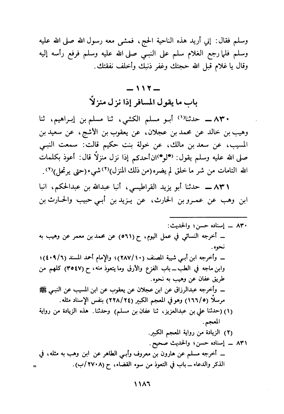 830- حَدَّثَنَا أَبُو مُسْلِمٍ الْكَشِّيُّ، حَدَّثَنَا مُسْلِمُ بْنُ إِبْرَاهِيمَ، حَدَّثَنَا وُهَيْبُ بْنُ خَالِدٍ، عَنْ مُحَمَّدِ بْنِ عَجْلاَنَ، عَنْ يَعْقُوبَ بْنِ الأَشَجِّ، عَنْ سَعِيدِ بْنِ الْمُسَيَّبِ، عَنْ سَعْدِ بْنِ مَالِكٍ، عَنْ خَوْلَةَ بِنْتِ حَكِيمٍ، قَالَتْ: سَمِعْتُ النَّبِيَّ صَلى الله عَلَيه وَسَلم يَقُولُ: لَوْ أَنَّ أَحَدَكُمْ إِذَا نَزَلَ مَنْزِلاً قَالَ: أَعُوذُ بِكَلِمَاتِ اللهِ التَّامَّاتِ, مِنْ شَرِّ مَا خَلَقَ, لَمْ يَضُرَّهُ مِنْ ذَلِكَ الْمَنْزِلِ شَيْءٌ حَتَّى يَرْتَحِلَ.
