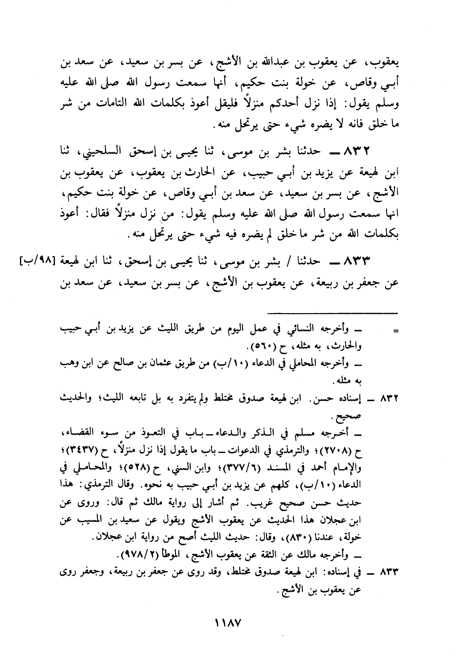 832- حَدَّثَنَا بِشْرُ بْنُ مُوسَى، حَدَّثَنَا يَحْيَى بْنُ إِسْحَاقَ السَّلْحِينِيُّ، حَدَّثَنَا ابْنُ لَهِيعَةَ، عَنْ يَزِيدَ بْنِ أَبِي حَبِيبٍ، عَنِ الْحَارِثِ بْنِ يَعْقُوبَ، عَنْ يَعْقُوبَ بْنِ الأَشَجِّ، عَنْ بُسْرِ بْنِ سَعِيدٍ، عَنْ سَعْدِ بْنِ أَبِي وَقَّاصٍ، عَنْ خَوْلَةَ بِنْتِ حَكِيمٍ، أَنَّهَا سَمِعَتْ رَسُولَ اللهِ صَلى الله عَلَيه وَسَلم يَقُولُ: مَنْ نَزَلَ مَنْزِلاً فَقَالَ: أَعُوذُ بِكَلِمَاتِ اللهِ مِنْ شَرِّ مَا خَلَقَ، لَمْ يَضُرَّهُ فِيهِ شَيْءٌ حَتَّى يَرْتَحِلَ مِنْهُ.