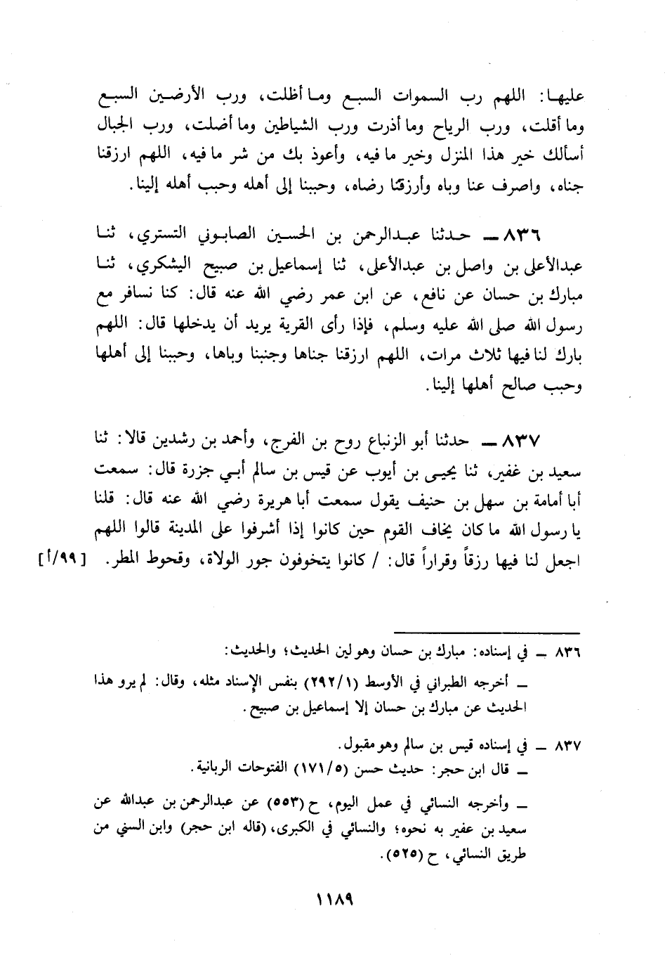 836- حَدَّثَنَا عَبْدُ الرَّحْمَنِ بْنُ الْحُسَيْنِ الصَّابُونِيُّ التُّسْتَرِيُّ، حَدَّثَنَا عَبْدُ الأَعْلَى بْنُ وَاصِلِ بْنِ عَبْدِ الأَعْلَى، حَدَّثَنَا إِسْمَاعِيلُ بْنُ صُبَيْحٍ الْيَشْكُرِيُّ، حَدَّثَنَا مُبَارَكُ بْنُ حَسَّانَ، عَنْ نَافِعٍ، عَنِ ابْنِ عُمَرَ، رَضِيَ اللَّهُ عَنْهُ قَالَ: كُنَّا نُسَافِرُ مَعَ رَسُولِ اللهِ صَلى الله عَلَيه وَسَلم, فَإِذَا رَأَى الْقَرْيَةَ يُرِيدُ أَنْ يَدْخُلَهَا قَالَ: اللَّهُمَّ بَارِكْ لَنَا فِيهَا, ثَلاَثَ مَرَّاتٍ, اللَّهُمَّ ارْزُقْنَا جَنَاهَا، وَجَنِّبْنَا وَبَاهَا، وَحَبِّبْنَا إِلَى أَهْلِهَا، وَحَبِّبْ صَالِحَ أَهْلِهَا إِلَيْنَا.