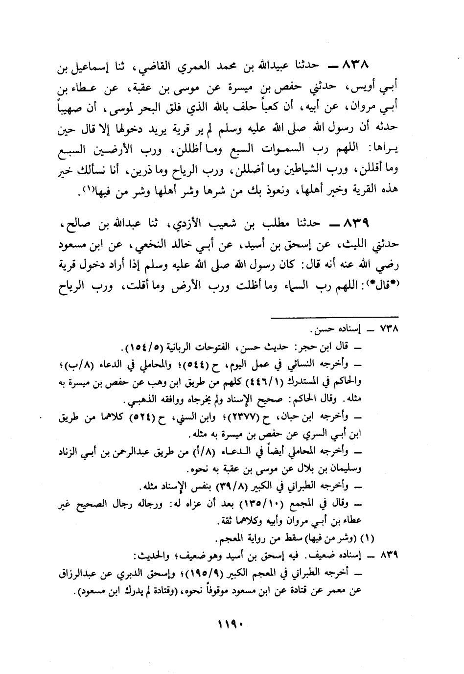 839- حَدَّثَنَا مُطَّلِبُ بْنُ شُعَيْبٍ الأَزْدِيُّ، حَدَّثَنَا عَبْدُ اللهِ بْنُ صَالِحٍ، حَدَّثَنِي اللَّيْثُ، عَنْ إِسْحَاقِ بْنِ أُسَيْدٍ، عَنْ أَبِي خَالِدٍ النَّخَعِيِّ، عَنِ ابْنِ مَسْعُودٍ، رَضِيَ اللَّهُ عَنْهُ, أَنَّهُ قَالَ: كَانَ رَسُولُ اللهِ صَلى الله عَلَيه وَسَلم إِذَا أَرَادَ دُخُولَ قَرْيَةٍ, قَالَ: اللَّهُمَّ رَبَّ السَّمَاءِ وَمَا أَظَلَّتْ، وَرَبَّ الأَرْضِ وَمَا أَقَلَّتْ، وَرَبَّ الرِّيَاحِ وَمَا ذَرَتْ، وَرَبَّ الشَّيَاطِينِ وَمَا أَضَلَّتْ، أَسْأَلُكَ خَيْرَهَا وَخَيْرَ مَا فِيهَا، وَأَعُوذُ بِكَ مِنْ شَرِّهَا وَشَرِّ مَا فِيهَا، اللَّهُمَّ حَبِّبْ إِلَيَّ خِيَارَ أَهْلِهَا، وَبَغِّضْ إِلَيَّ شِرَارَهُمْ.