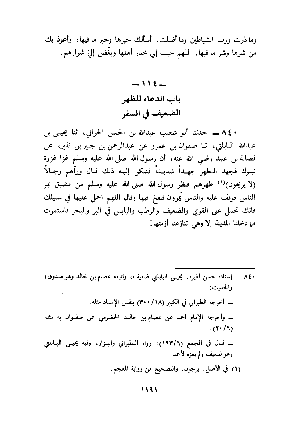 840- حَدَّثَنَا أَبُو شُعَيْبٍ عَبْدُ اللهِ بْنُ الْحَسَنِ الْحَرَّانِيُّ، حَدَّثَنَا يَحْيَى بْنُ عَبْدِ اللهِ الْبَابْلُتِّيُّ، حَدَّثَنَا صَفْوَانُ بْنُ عَمْرٍو، عَنْ عَبْدِ الرَّحْمَنِ بْنِ جُبَيْرِ بْنِ نُفَيْرٍ، عَنْ فَضَالَةَ بْنِ عُبَيْدٍ، رَضِيَ اللَّهُ عَنْهُ, أَنَّ رَسُولَ اللهِ صَلى الله عَلَيه وَسَلم غَزَا غَزْوَةَ تَبُوكَ, فَجَهَدَ الظَّهْرُ جَهْدًا شَدِيدًا، فَشَكَوْا إِلَيْهِ ذَلِكَ, قَالَ: وَرَآهُمْ رِجَالاً لاَ يَرِيحُونَ ظَهْرَهُمْ, فَنَظَرَ رَسُولُ اللهِ صَلى الله عَلَيه وَسَلم مِنْ مَضِيقِ يَمُرُّ النَّاسُ, فَوَقَفَ عَلَيْهِ، وَالنَّاسُ يَمُرُّونَ, فَنَفَخَ فِيهَا وَقَالَ: اللَّهُمَّ احْمِلْ عَلَيْهَا فِي سَبِيلِكَ, فَإِنَّكَ تَحْمِلُ عَلَى الْقَوِيِّ وَالضَّعِيفِ، وَالرَّطَبِ وَالْيَابِسِ فِي الْبَرِّ وَالْبَحْرِ, فَاسْتَمْرَتْ, فَمَا دَخَلْنَا الْمَدِينَةَ إِلاَّ وَهِيَ تُنَازِعُنَا أَزِمَّتَهَا.