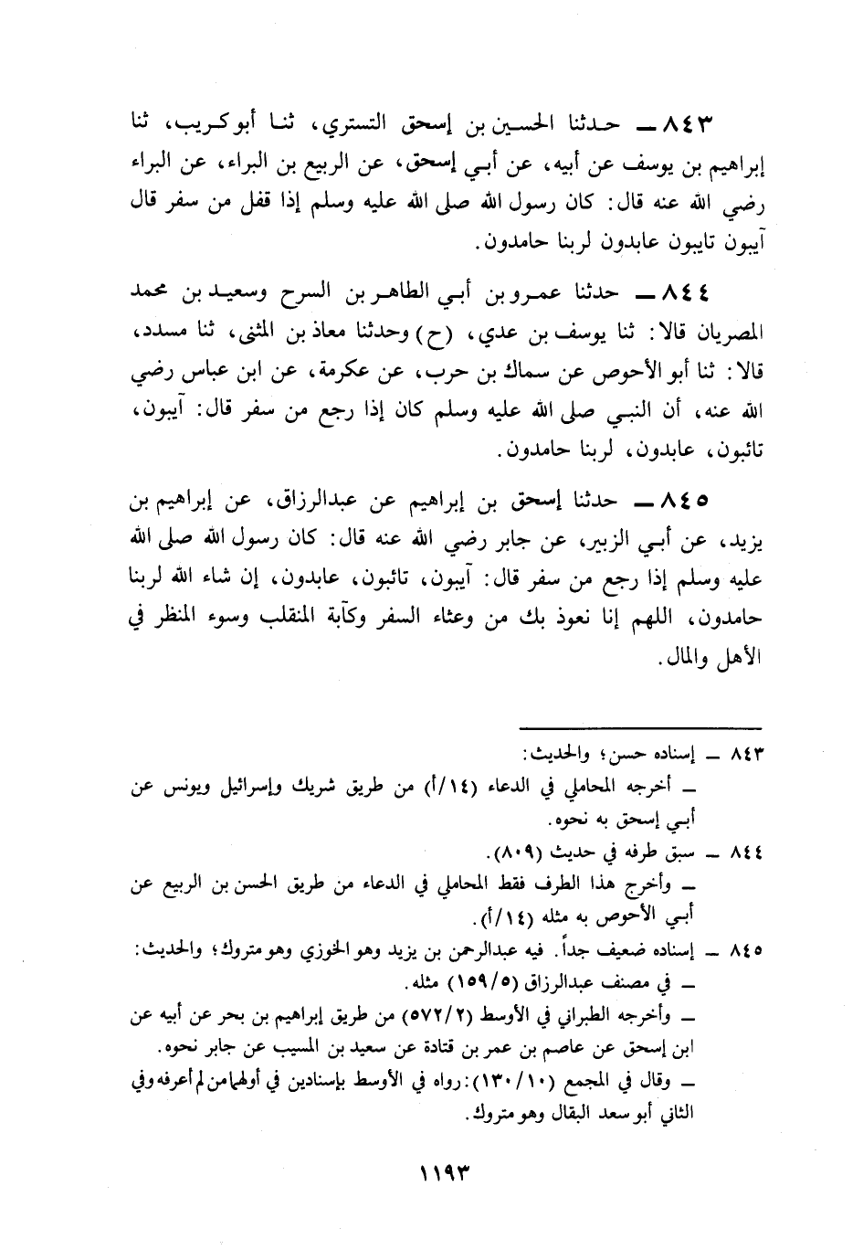 843- حَدَّثَنَا الْحُسَيْنُ بْنُ إِسْحَاقَ التُّسْتَرِيُّ، حَدَّثَنَا أَبُو كُرَيْبٍ، حَدَّثَنَا إِبْرَاهِيمُ بْنُ يُوسُفَ، عَنْ أَبِيهِ، عَنْ أَبِي إِسْحَاقَ، عَنِ الرَّبِيعِ بْنِ الْبَرَاءِ، عَنِ الْبَرَاءِ، رَضِيَ اللَّهُ عَنْهُ قَالَ: كَانَ رَسُولُ اللهِ صَلى الله عَلَيه وَسَلم إِذَا قَفَلَ مِنْ سَفَرٍ قَالَ: آيِبُونَ تَايِبُونَ عَابِدُونَ, لِرَبِّنَا حَامِدُونَ.