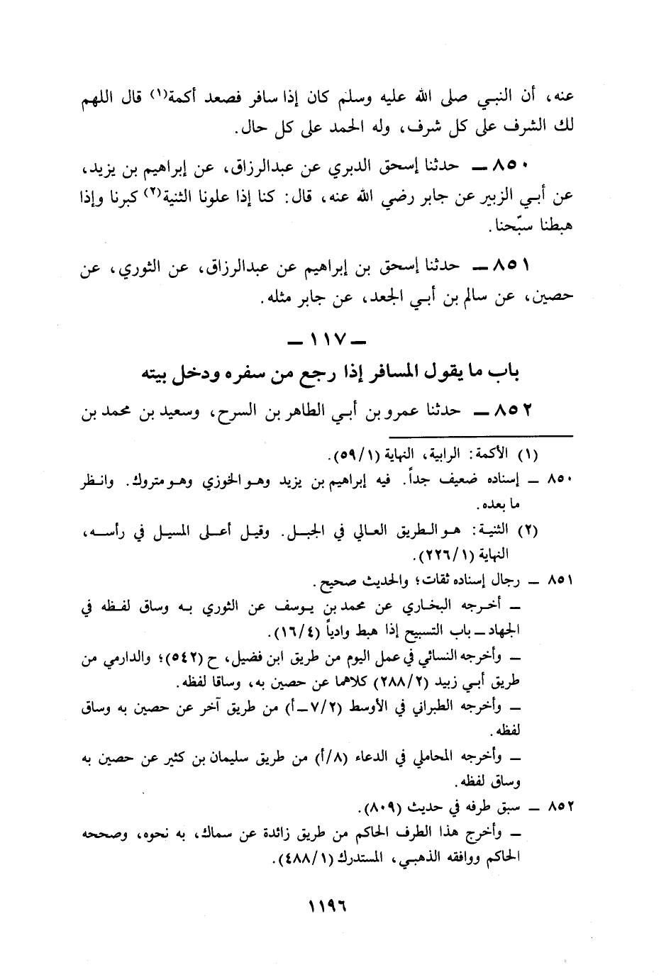 850- حَدَّثَنَا إِسْحَاقُ الدَّبَرِيُّ، عَنْ عَبْدِ الرَّزَّاقِ، عَنْ إِبْرَاهِيمَ بْنِ يَزِيدَ، عَنْ أَبِي الزُّبَيْرِ، عَنْ جَابِرٍ، رَضِيَ اللَّهُ عَنْهُ قَالَ: كُنَّا إِذَا عَلَوْنَا الثَّنِيَّةَ كَبَّرْنَا, وَإِذَا هَبَطْنَا سَبَّحْنَا.