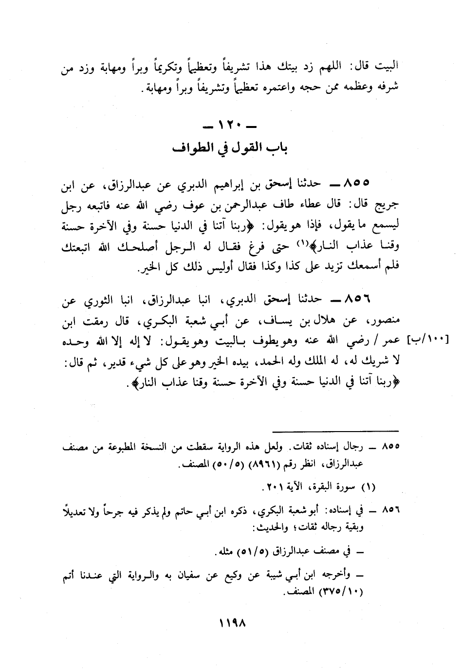 855- حَدَّثَنَا إِسْحَاقُ بْنُ إِبْرَاهِيمَ الدَّبَرِيُّ، عَنْ عَبْدِ الرَّزَّاقِ، عَنِ ابْنِ جُرَيْجٍ، قَالَ: قَالَ عَطَاءٌ: طَافَ عَبْدُ الرَّحْمَنِ بْنُ عَوْفٍ رَضِيَ اللَّهُ عَنْهُ, فَاتَّبَعَهُ رَجُلٌ لَيَسْمَعَ مَا يَقُولُ، فَإِذَا هُوَ يَقُولُ: {رَبَّنَا آتِنَا فِي الدُّنْيَا حَسَنَةً وَفِي الآخِرَةِ حَسَنَةً وَقِنَا عَذَابَ النَّارِ} حَتَّى فَرَغَ، فَقَالَ لَهُ الرَّجُلُ: أَصْلَحَكَ اللَّهُ اتَّبَعْتُكَ, فَلَمْ أَسْمَعْكَ تَزِيدُ عَلَى كَذَا وَكَذَا, فَقَالَ: أَوَلَيْسَ ذَلِكَ كُلَّ الْخَيْرِ ؟.