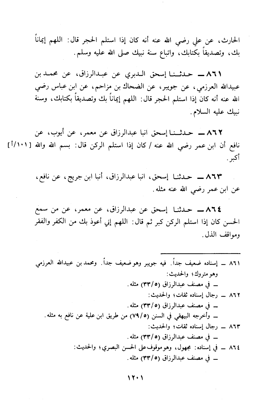 861- حَدَّثَنَا إِسْحَاقُ الدَّبَرِيُّ، عَنْ عَبْدِ الرَّزَّاقِ، عَنْ مُحَمَّدِ بْنِ عُبَيْدِ اللهِ الْعَرْزَمِيِّ، عَنْ جُوَيْبِرٍ، عَنِ الضَّحَّاكِ بْنِ مُزَاحِمٍ، عَنِ ابْنِ عَبَّاسٍ، رَضِيَ اللَّهُ عَنْهُ, أَنَّهُ كَانَ إِذَا اسْتَلَمَ الْحَجَرَ قَالَ: اللَّهُمَّ إِيمَانًا بِكَ، وَتَصْدِيقًا بِكِتَابِكَ، وَسُنَّةِ نَبِيِّكَ عَلَيْهِ السَّلاَمُ.