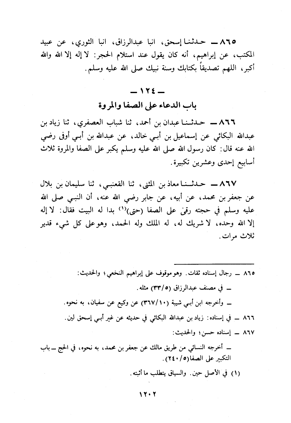 865- حَدَّثَنَا إِسْحَاقُ، أَخْبَرَنَا عَبْدُ الرَّزَّاقِ، أَخْبَرَنَا الثَّوْرِيُّ، عَنْ عُبَيْدٍ الْمُكْتِبِ، عَنْ إِبْرَاهِيمَ، أَنَّهُ كَانَ يَقُولُ عِنْدَ اسْتِلاَمِ الْحَجَرِ: لاَ إِلَهَ إِلاَّ اللَّهُ، وَاللَّهُ أَكْبَرُ، اللَّهُمَّ تَصْدِيقًا بِكِتَابِكَ, وَسُنَّةِ نَبِيِّكَ صَلى الله عَلَيه وَسَلم.