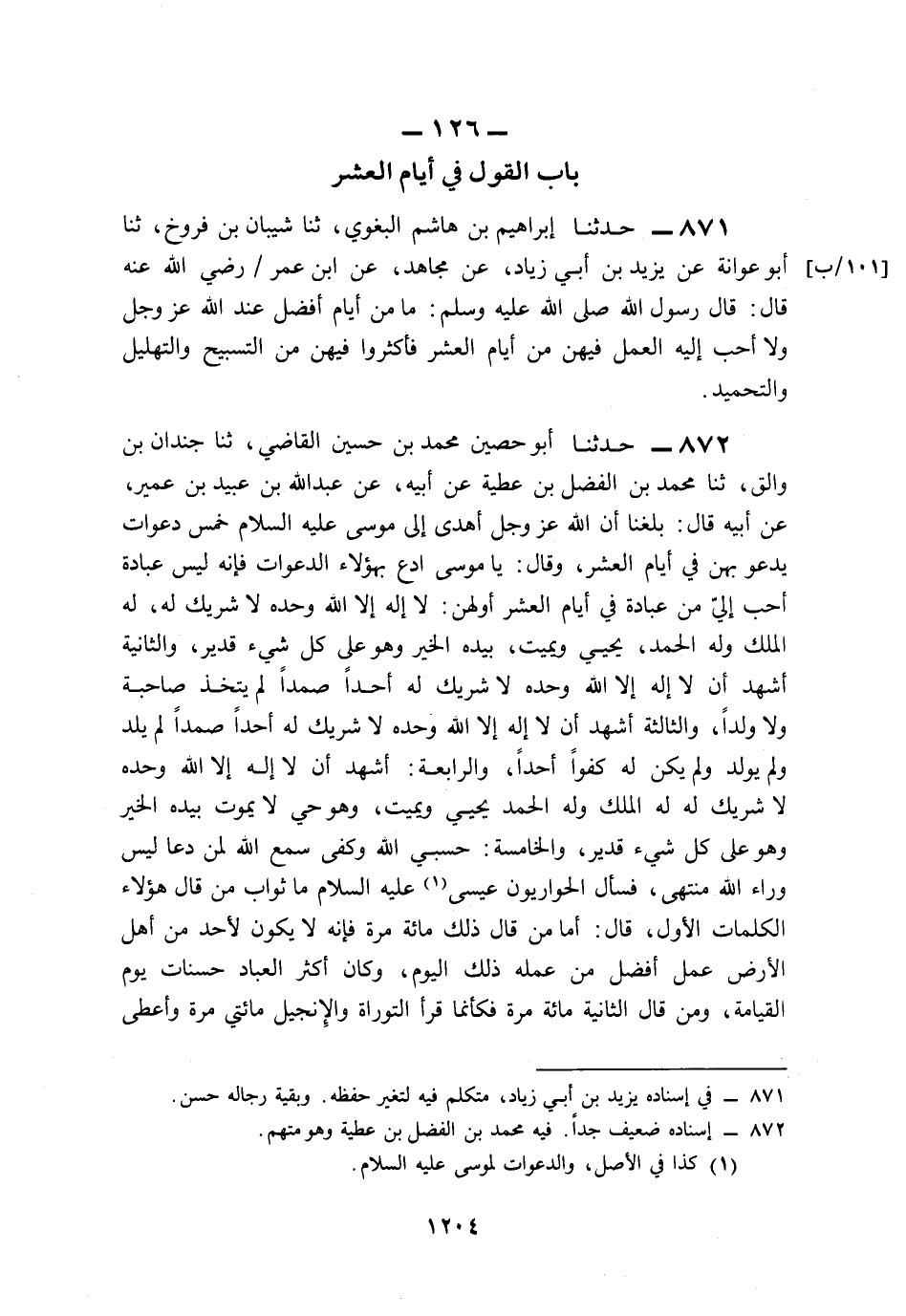 872- حَدَّثَنَا أَبُو حَصِينٍ مُحَمَّدُ بْنُ حُسَيْنٍ الْقَاضِي، حَدَّثَنَا جُنْدَلُ (1) بْنُ وَالِقٍ، حَدَّثَنَا مُحَمَّدُ بْنُ الْفَضْلِ بْنِ عَطِيَّةَ، عَنْ أَبِيهِ، عَنْ عَبْدِ اللهِ بْنِ عُبَيْدِ بْنِ عُمَيْرٍ، عَنْ أَبِيهِ، قَالَ: بَلَغَنَا أَنَّ اللَّهَ عَزَّ وَجَلَّ أَهْدَى إِلَى مُوسَى عَلَيْهِ السَّلاَمُ خَمْسَ دَعَوَاتٍ يَدْعُو بِهِنَّ فِي أَيَّامِ الْعَشْرِ وَقَالَ: يَا مُوسَى ادْعُ بِهَؤُلاَءِ الدَّعَوَاتِ, فَإِنَّهُ لَيْسَ عِبَادَةٌ أَحَبَّ إِلَيَّ مِنْ عِبَادَةٍ فِي أَيَّامِ الْعَشْرِ, أَوَّلُهُنَّ لاَ إِلَهَ إِلاَّ اللَّهُ وَحْدَهُ لاَ شَرِيكَ لَهُ، لَهُ الْمُلْكُ وَلَهُ الْحَمْدُ يُحْيِي وَيُمِيتُ, بِيَدِهِ الْخَيْرُ, وَهُوَ عَلَى كُلِّ شَيْءٍ قَدِيرٌ، وَالثَّانِيَةُ أَشْهَدُ أَنْ لاَ إِلَهَ إِلاَّ اللَّهُ وَحْدَهُ لاَ شَرِيكَ لَهُ، أَحَدًا صَمَدًا لَمْ يَتَّخِذْ صَاحِبَةً وَلاَ وَلَدًا،