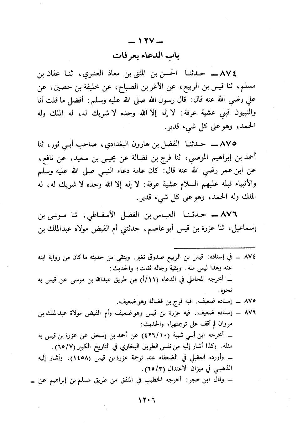 875- حَدَّثَنَا الْفَضْلُ بْنُ هَارُونَ الْبَغْدَادِيُّ، صَاحِبُ أَبِي ثَوْرٍ، حَدَّثَنَا أَحْمَدُ بْنُ إِبْرَاهِيمَ الْمَوْصِلِيُّ، حَدَّثَنَا فَرَجُ بْنُ فَضَالَةَ، عَنْ يَحْيَى بْنِ سَعِيدٍ، عَنْ نَافِعٍ، عَنِ ابْنِ عُمَرَ، رَضِيَ اللَّهُ عَنْهُ قَالَ: كَانَ عَامَّةُ دُعَاءِ النَّبِيِّ صَلى الله عَلَيه وَسَلم وَالأَنْبِيَاءِ قَبْلَهُ عَلَيْهِمُ السَّلاَمُ عَشِيَّةَ عَرَفَةَ: لاَ إِلَهَ إِلاَّ اللَّهُ وَحْدَهُ لاَ شَرِيكَ لَهُ، لَهُ الْمُلْكُ وَلَهُ الْحَمْدُ، وَهُوَ عَلَى كُلِّ شَيْءٍ قَدِيرٌ.