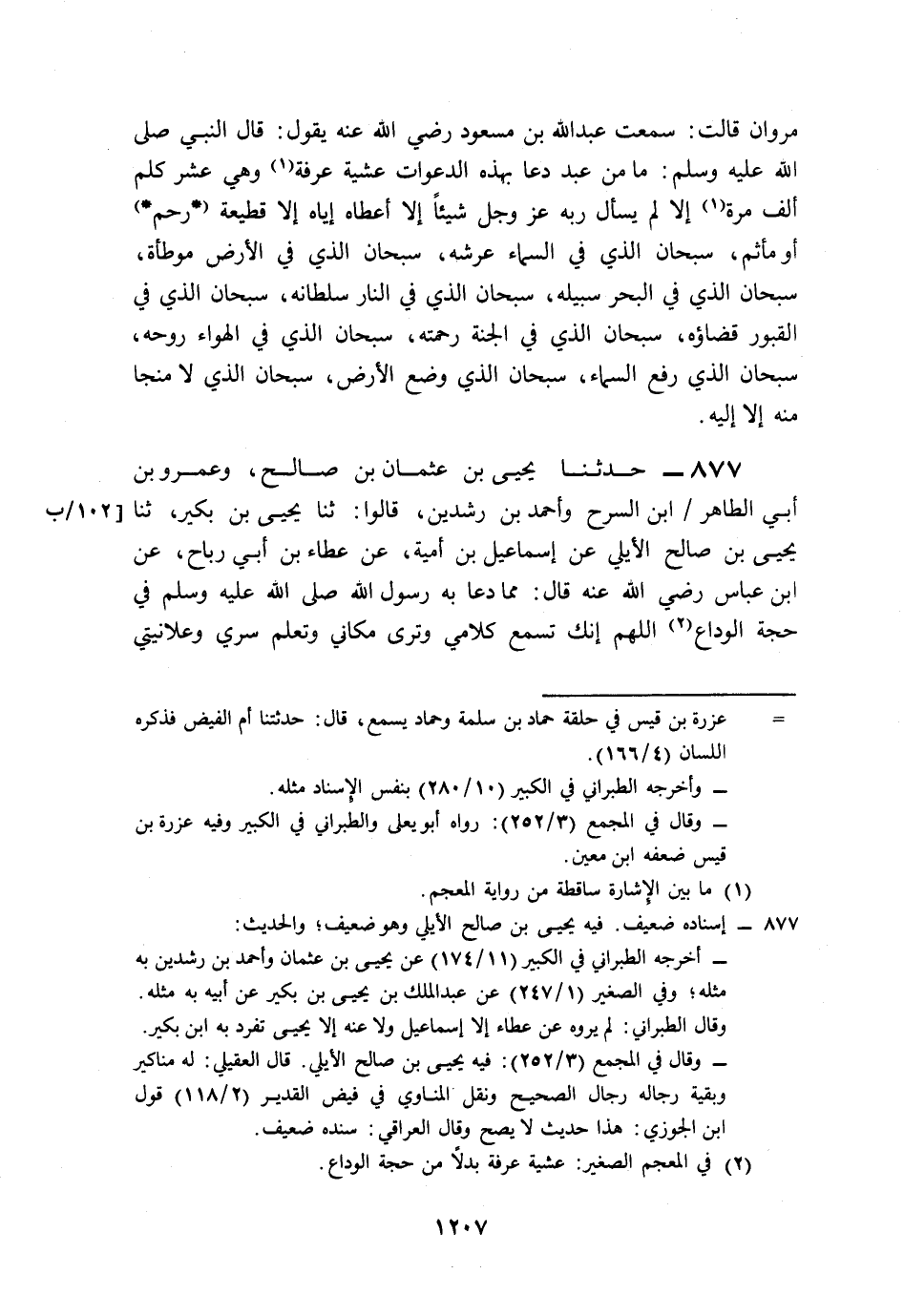 877- حَدَّثَنَا يَحْيَى بْنُ عُثْمَانَ بْنِ صَالِحٍ، وَعَمْرُو بْنُ أَبِي الطَّاهِرِ بْنِ السَّرْحِ، وَأَحْمَدُ بْنُ رِشْدِينَ، قَالُوا: حَدَّثَنَا يَحْيَى بْنُ بُكَيْرٍ، حَدَّثَنَا يَحْيَى بْنُ صَالِحٍ الأَيْلِيُّ، عَنْ إِسْمَاعِيلَ بْنِ أُمَيَّةَ، عَنْ عَطَاءِ بْنِ أَبِي رَبَاحٍ، عَنِ ابْنِ عَبَّاسٍ، رَضِيَ اللَّهُ عَنْهُ قَالَ: مِمَّا دَعَا بِهِ رَسُولُ اللهِ صَلى الله عَلَيه وَسَلم فِي حَجَّةِ الْوَدَاعِ: اللَّهُمَّ إِنَّكَ تَسْمَعُ كَلاَمِي، وَتَرَى مَكَانِي، وَتَعْلَمُ سِرِّي وَعَلاَنِيَتِي، لاَ يَخْفَى عَلَيْكَ شَيْءٌ مِنْ أَمْرِي، أَنَا الْبَائِسُ الْفَقِيرُ, الْمُسْتَغِيثُ الْمُسْتَجِيرُ, الْوَجِلُ الْمُشْفِقُ, الْمُقِرُّ الْمُعْتَرِفُ بِذَنْبِهِ، أَسْأَلُكَ مَسْأَلَةَ الْمِسْكِينِ, وَأَبْتَهِلُ إِلَيْكَ ابْتِهَالَ الْمُذْنِبِ الذَّلِيلِ، وَأَدْعُوكَ دُعَاءَ الْخَائِفِ الضَّرِيرِ، مَنْ خَشَعَتْ لَكَ رَقَبَتُهُ، وَفَاضَتْ لَكَ عَيْنَاهُ، وَذَلَّ لَكَ جَسَدَهُ, وَرَغِمَ أَنْفُهُ لَكَ، اللَّهُمَّ لاَ تَجْعَلْنِي بِدُعَائِكَ شَقِيًّا، وَكُنْ بِي رَؤُوفًا رَحِيمًا, يَا خَيْرَ الْمَسْؤُولِينَ, وَيَا خَيْرَ الْمُعْطِينَ.