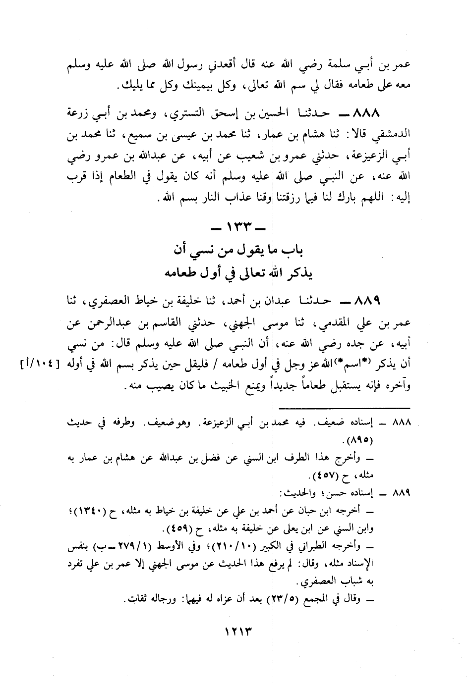 888- حَدَّثَنَا الْحُسَيْنُ بْنُ إِسْحَاقَ التُّسْتَرِيُّ، وَمُحَمَّدُ بْنُ أَبِي زُرْعَةَ الدِّمَشْقِيُّ، قَالاَ: حَدَّثَنَا هِشَامُ بْنُ عَمَّارٍ، حَدَّثَنَا مُحَمَّدُ بْنُ عِيسَى بْنِ سُمَيْعٍ، حَدَّثَنَا مُحَمَّدُ بْنُ أَبِي الزُّعَيْزِعَةِ، حَدَّثَنِي عَمْرُو بْنُ شُعَيْبٍ، عَنْ أَبِيهِ، عَنْ عَبْدِ اللهِ بْنِ عَمْرٍو، رَضِيَ اللَّهُ عَنْهُ, عَنِ النَّبِيِّ صَلى الله عَلَيه وَسَلم, أَنَّهُ كَانَ يَقُولُ فِي الطَّعَامِ إِذَا قُرِّبَ إِلَيْهِ: اللَّهُمَّ بَارِكْ لَنَا فِيمَا رَزَقْتَنَا، وَقِنَا عَذَابَ النَّارِ، بِسْمِ اللهِ.