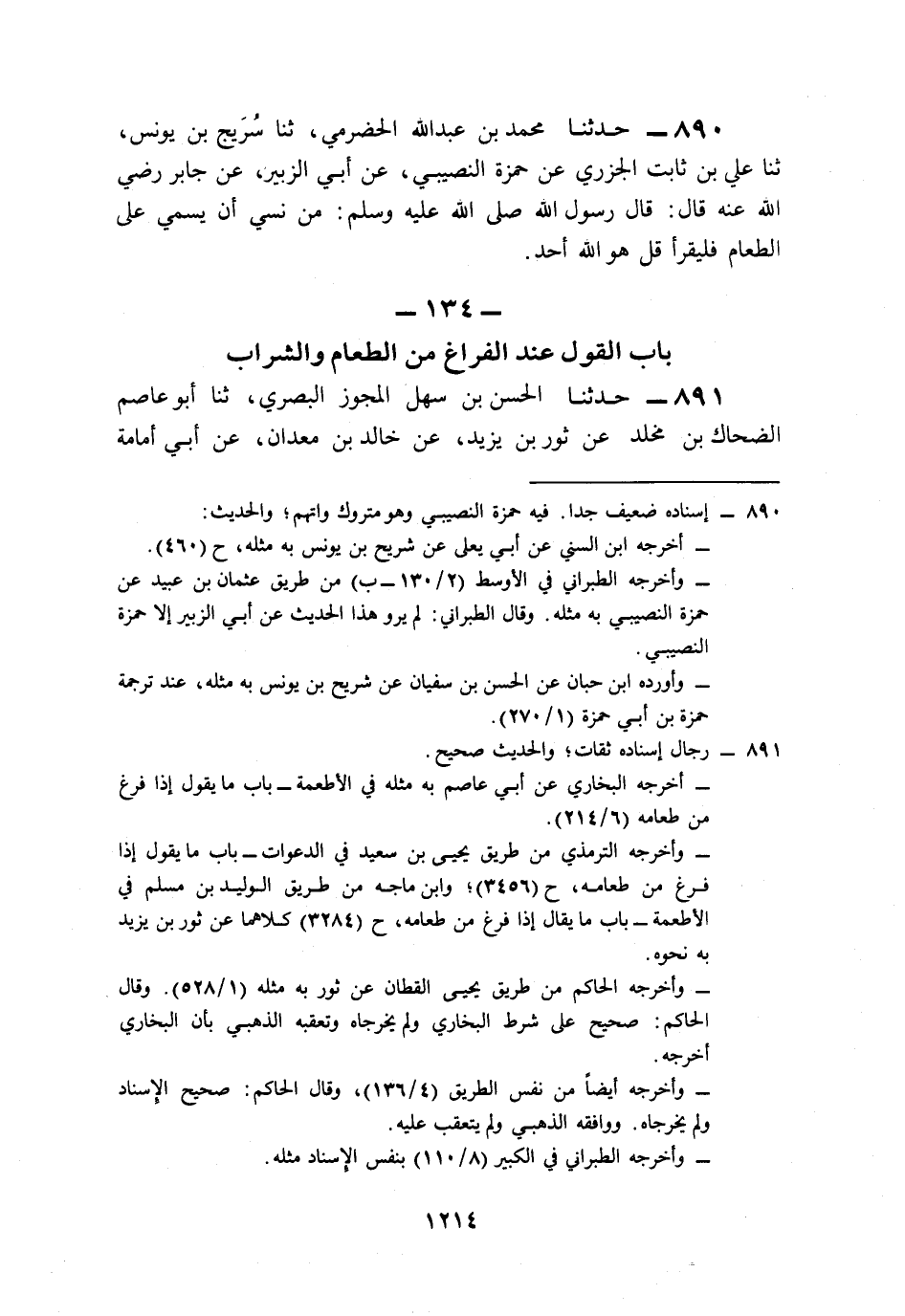 891- حَدَّثَنَا الْحَسَنُ بْنُ سَهْلٍ الْمُجَوِّزُ الْبَصْرِيُّ، حَدَّثَنَا أَبُو عَاصِمٍ الضَّحَّاكُ بْنُ مَخْلَدٍ، عَنْ ثَوْرِ بْنِ يَزِيدَ، عَنْ خَالِدِ بْنِ مَعْدَانَ، عَنْ أَبِي أُمَامَةَ الْبَاهِلِيِّ، رَضِيَ اللَّهُ عَنْهُ, أَنَّ النَّبِيَّ صَلى الله عَلَيه وَسَلم كَانَ إِذَا رُفِعَ الْعَشَاءُ مِنْ بَيْنِ يَدَيْهِ قَالَ: الْحَمْدُ لِلَّهِ كَثِيرًا طَيِّبًا مُبَارَكًا فِيهِ، غَيْرَ مَكْفِيٍّ وَلاَ مُوَدَّعٍ, وَلاَ مُسْتَغْنًى عَنْهُ رَبَّنَا.