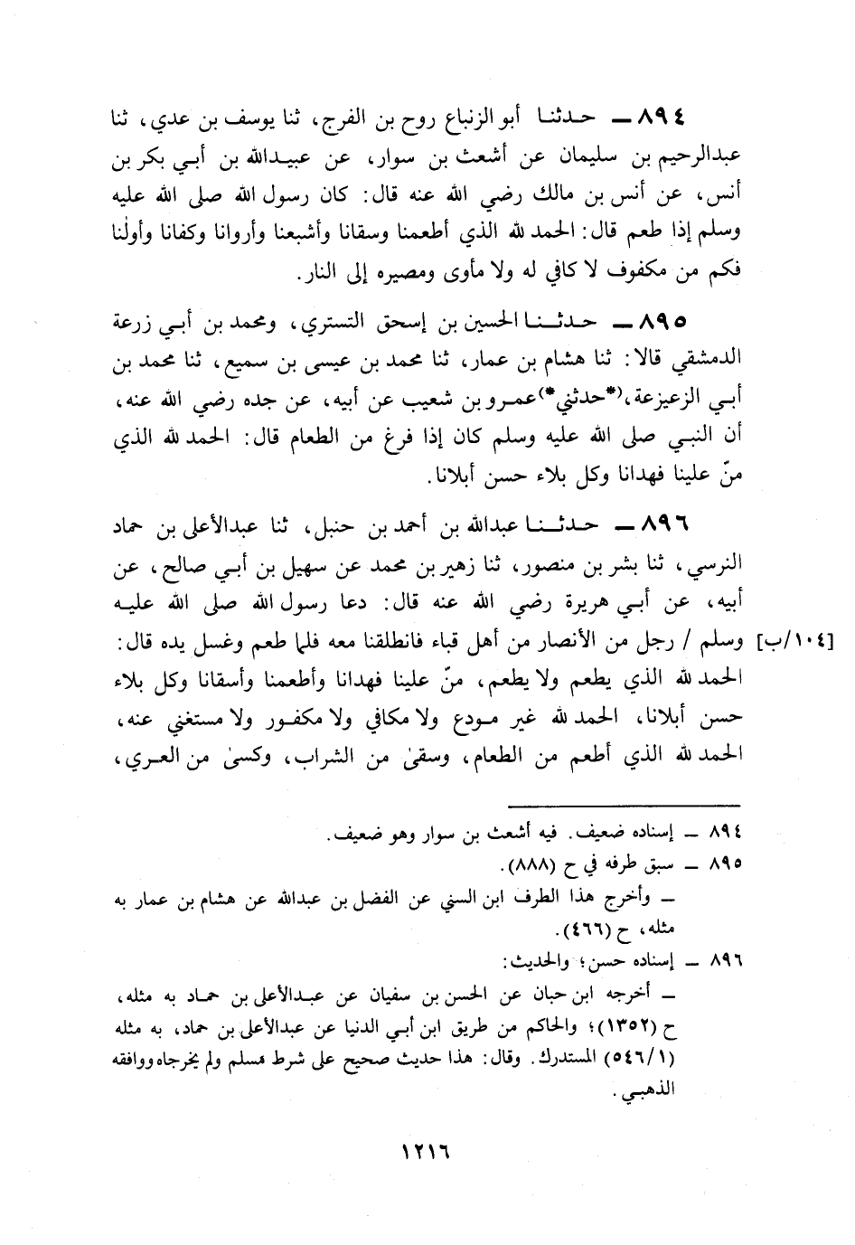 896- حَدَّثَنَا عَبْدُ اللهِ بْنُ أَحْمَدَ بْنِ حَنْبَلٍ، حَدَّثَنَا عَبْدُ الأَعْلَى بْنُ حَمَّادِ النَّرْسِيُّ، حَدَّثَنَا بِشْرُ بْنُ مَنْصُورٍ، حَدَّثَنَا زُهَيْرُ بْنُ مُحَمَّدٍ، عَنْ سُهَيْلِ بْنِ أَبِي صَالِحٍ، عَنْ أَبِيهِ، عَنْ أَبِي هُرَيْرَةَ، رَضِيَ اللَّهُ عَنْهُ قَالَ: دَعَا رَسُولَ اللهِ صَلى الله عَلَيه وَسَلم رَجُلٌ مِنَ الأَنْصَارِ مِنْ أَهْلِ قُبَاءَ، فَانْطَلَقْنَا مَعَهُ, فَلَمَّا طَعِمَ وَغَسَلَ يَدَهُ قَالَ: الْحَمْدُ لِلَّهِ الَّذِي يُطْعِمُ وَلاَ يُطْعَمُ، مَنَّ عَلَيْنَا فَهَدَانَا, وَأَطْعَمَنَا وَأَسْقَانَا، وَكُلَّ بَلاَءٍ حَسَنٍ أَبْلاَنَا، الْحَمْدُ لِلَّهِ غَيْرَ مُوَدَّعٍ وَلاَ مُكَافِي وَلاَ مَكْفُورٍ وَلاَ مُسْتَغْنًى عَنْهُ، الْحَمْدُ لِلَّهِ الَّذِي أَطْعَمَ مِنَ الطَّعَامِ، وَسَقَى مِنَ الشَّرَابِ، وَكَسَى مِنَ الْعُرْيِ، وَهَدَى مِنَ الضَّلاَلَةِ، وَبَصَّرَ مِنَ الْعَمَى، وَفَضَّلَ عَلَى كَثِيرٍ مِمَّنْ خَلَقَ تَفْضِيلاً، الْحَمْدُ لِلَّهِ رَبِّ الْعَالَمِينَ.