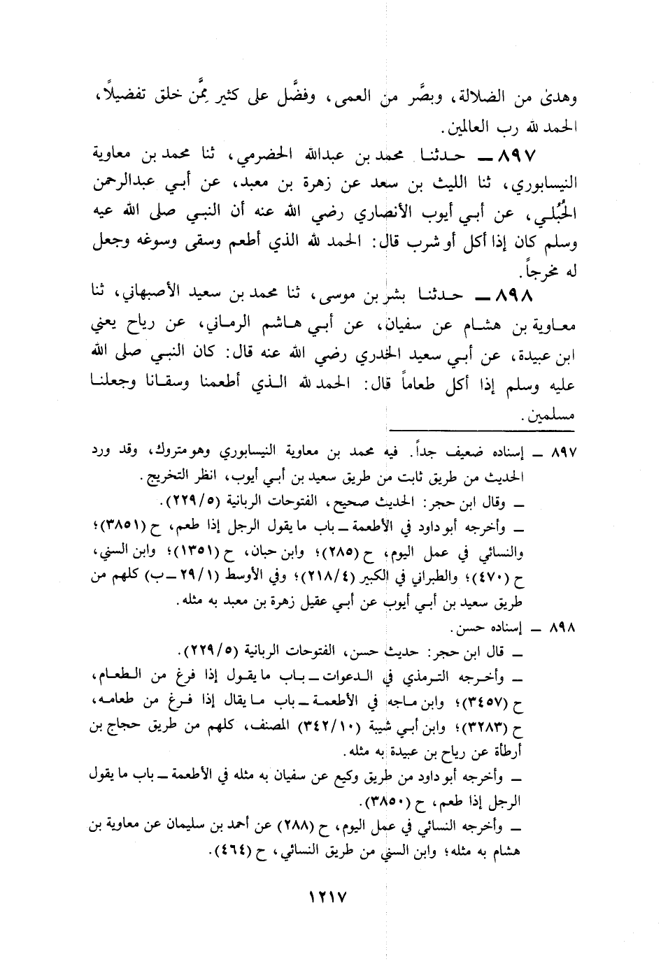 897- حَدَّثَنَا مُحَمَّدُ بْنُ عَبْدِ اللهِ الْحَضْرَمِيُّ، حَدَّثَنَا مُحَمَّدُ بْنُ مُعَاوِيَةَ النَّيْسَابُورِيُّ، حَدَّثَنَا اللَّيْثُ بْنُ سَعْدٍ، عَنْ زُهْرَةَ بْنِ مَعْبَدٍ، عَنْ أَبِي عَبْدِ الرَّحْمَنِ الْحُبُلِيِّ، عَنْ أَبِي أَيُّوبَ الأَنْصَارِيِّ، رَضِيَ اللَّهُ عَنْهُ, أَنَّ النَّبِيَّ صَلى الله عَلَيه وَسَلم كَانَ إِذَا أَكَلَ أَوْ شَرِبَ قَالَ: الْحَمْدُ لِلَّهِ الَّذِي أَطْعَمَ وَسَقَى، وَسَوَّغَهُ وَجَعَلَ لَهُ مَخْرَجًا.