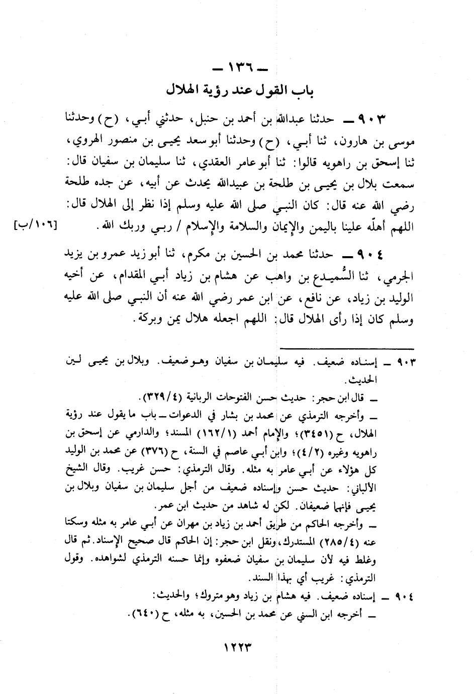 903- حَدَّثَنَا عَبْدُ اللهِ بْنُ أَحْمَدَ بْنِ حَنْبَلٍ، حَدَّثَنِي أَبِي (ح) وَحَدَّثَنَا مُوسَى بْنُ هَارُونَ، حَدَّثَنَا أَبِي (ح) وَحَدَّثَنَا أَبُو سَعْدٍ يَحْيَى بْنُ مَنْصُورٍ الْهَرَوِيُّ، حَدَّثَنَا إِسْحَاقُ بْنُ رَاهَوَيْهِ، قَالُوا: حَدَّثَنَا أَبُو عَامِرٍ الْعَقَدِيُّ، حَدَّثَنَا سُلَيْمَانُ بْنُ سُفْيَانَ، قَالَ: سَمِعْتُ بِلاَلَ بْنَ يَحْيَى بْنِ طَلْحَةَ بْنِ عُبَيْدِ اللهِ يُحَدِّثُ عَنْ أَبِيهِ، عَنْ جَدِّهِ طَلْحَةَ رَضِيَ اللَّهُ عَنْهُ قَالَ: كَانَ النَّبِيُّ صَلى الله عَلَيه وَسَلم إِذَا نَظَرَ إِلَى الْهِلاَلِ قَالَ: اللَّهُمَّ أَهِلَّهُ عَلَيْنَا بِالْيُمْنِ وَالإِيمَانِ، وَالسَّلاَمَةِ وَالإِسْلاَمِ، رَبِّي وَرَبُّكَ اللَّهُ.