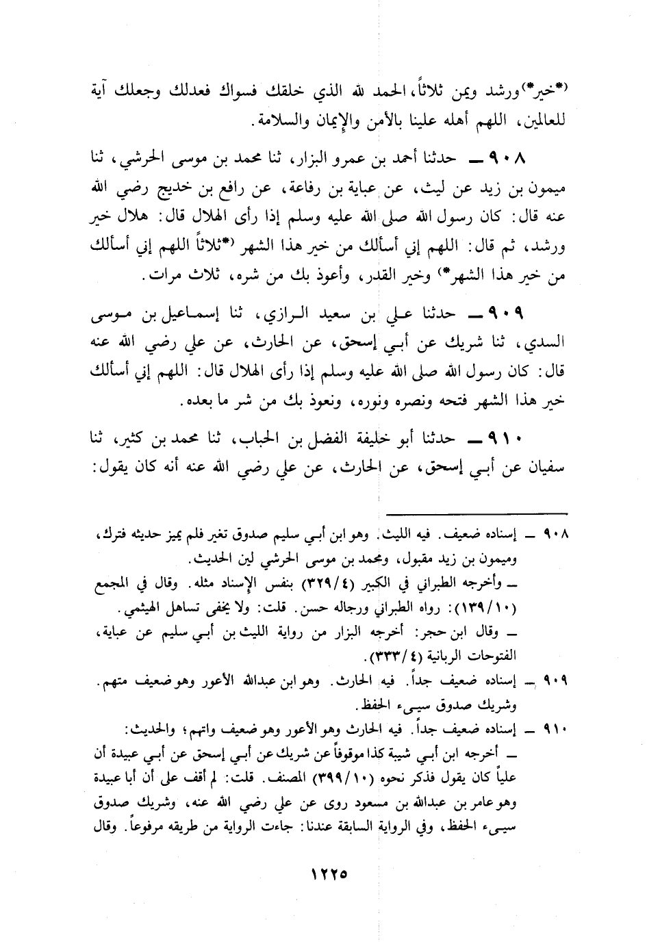 909- حَدَّثَنَا عَلِيُّ بْنُ سَعِيدٍ الرَّازِيُّ، حَدَّثَنَا إِسْمَاعِيلُ بْنُ مُوسَى السُّدِّيُّ، حَدَّثَنَا شَرِيكٌ، عَنْ أَبِي إِسْحَاقَ، عَنِ الْحَارِثِ، عَنْ عَلِيٍّ، رَضِيَ اللَّهُ عَنْهُ قَالَ: كَانَ رَسُولُ اللهِ صَلى الله عَلَيه وَسَلم إِذَا رَأَى الْهِلاَلَ قَالَ: اللَّهُمَّ إِنِّي أَسْأَلُكَ خَيْرَ هَذَا الشَّهْرِ فَتْحَهُ وَنَصْرَهُ وَنُورَهُ، وَنَعُوذُ بِكَ مِنْ شَرِّ مَا بَعْدَهُ.