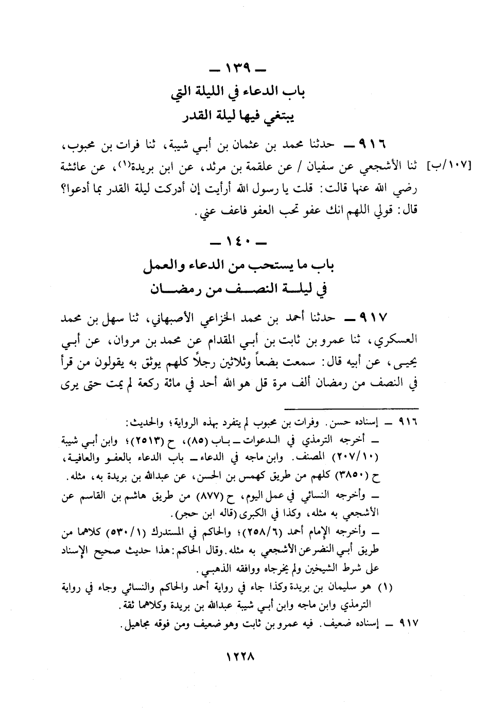 916- حَدَّثَنَا مُحَمَّدُ بْنُ عُثْمَانَ بْنِ أَبِي شَيْبَةَ، حَدَّثَنَا فُرَاتُ بْنُ مَحْبُوبٍ، حَدَّثَنَا الأَشْجَعِيُّ، عَنْ سُفْيَانَ، عَنْ عَلْقَمَةَ بْنِ مَرْثَدٍ، عَنِ ابْنِ بُرَيْدَةَ، عَنْ عَائِشَةَ، رَضِيَ اللَّهُ عَنْهَا قَالَتْ: قُلْتُ: يَا رَسُولَ اللهِ، أَرَأَيْتَ إِنْ أَدْرَكْتُ لَيْلَةَ الْقَدْرِ بِمَا أَدْعُو؟ قَالَ: قُولِي: اللَّهُمَّ إِنَّكَ عَفُوٌّ تُحِبُّ الْعَفْوَ, فَاعْفُ عَنِّي.