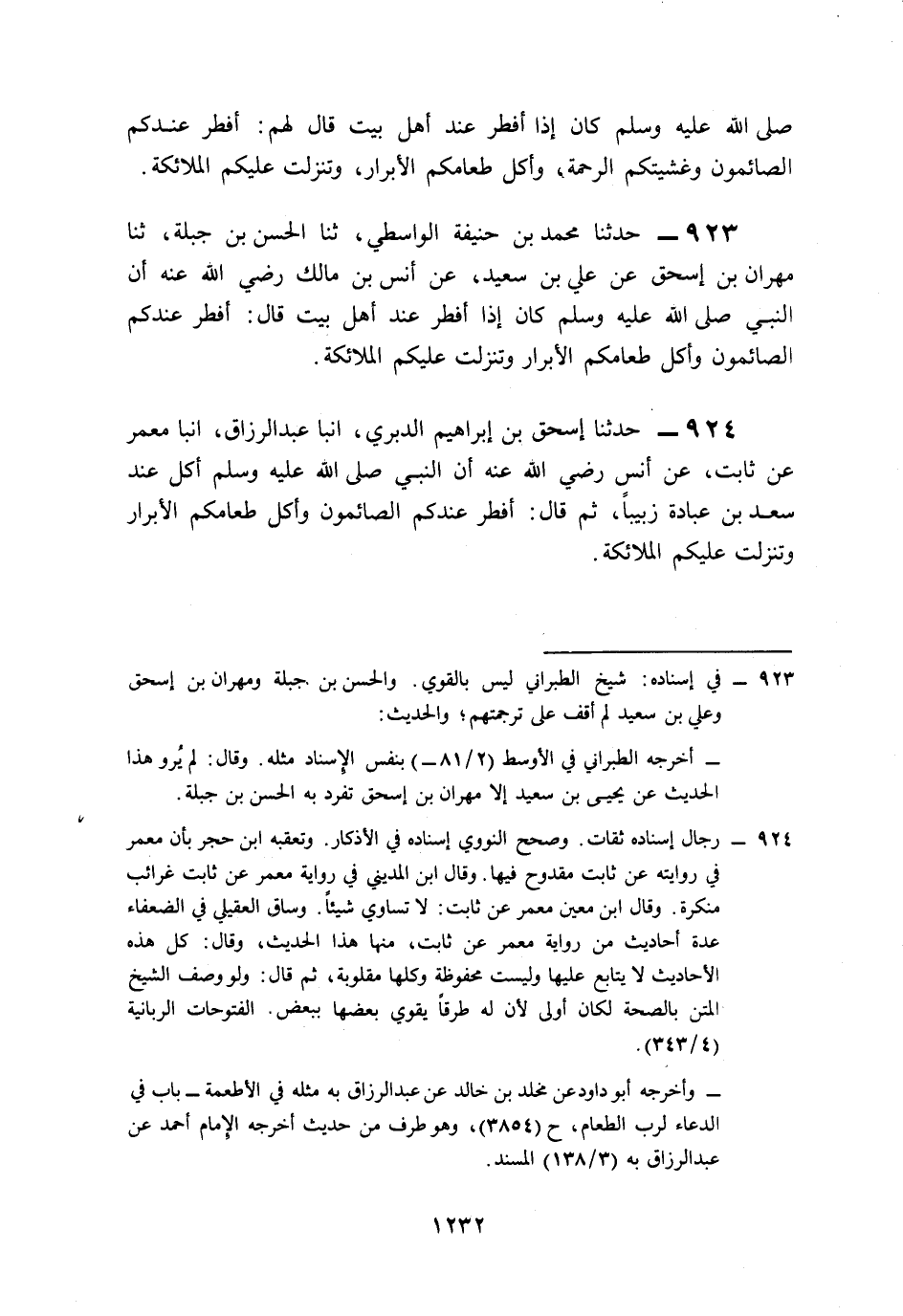 923- حَدَّثَنَا مُحَمَّدُ بْنُ حَنِيفَةَ الْوَاسِطِيُّ، حَدَّثَنَا الْحَسَنُ بْنُ جَبَلَةَ، حَدَّثَنَا مِهْرَانُ بْنُ إِسْحَاقَ، عَنْ عَلِيِّ بْنِ سَعِيدٍ، عَنْ أَنَسِ بْنِ مَالِكٍ، رَضِيَ اللَّهُ عَنْهُ, أَنَّ النَّبِيِّ صَلى الله عَلَيه وَسَلم كَانَ إِذَا أَفْطَرَ عِنْدَ أَهْلِ بَيْتٍ قَالَ: أَفْطَرَ عِنْدَكُمُ الصَّائِمُونَ، وَأَكَلَ طَعَامَكُمُ الأَبْرَارُ، وَتَنَزَّلَتْ عَلَيْكُمُ الْمَلاَئِكَةُ.