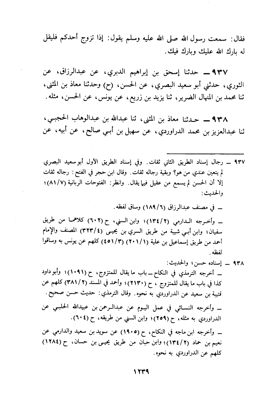 938- حَدَّثَنَا مُعَاذُ بْنُ الْمُثَنَّى، حَدَّثَنَا عَبْدُ اللهِ بْنُ عَبْدِ الْوَهَّابِ الْحَجَبِيُّ، حَدَّثَنَا عَبْدُ الْعَزِيزِ بْنُ مُحَمَّدٍ الدَّرَاوَرْدِيُّ، عَنْ سُهَيْلِ بْنِ أَبِي صَالِحٍ، عَنْ أَبِيهِ، عَنْ أَبِي هُرَيْرَةَ، رَضِيَ اللَّهُ عَنْهُ, أَنَّ رَسُولَ اللهِ صَلى الله عَلَيه وَسَلم كَانَ إِذَا رَفَّحَ قَوْمًا, قَالَ: بَارَكَ اللَّهُ لَكُمْ، وَبَارَكَ عَلَيْكُمْ.