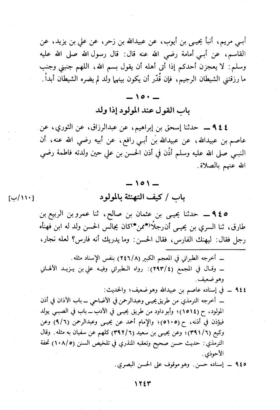150- بَابُ الْقَوْلِ عِنْدَ الْمَوْلُودِ إِذَا وُلِدَ.