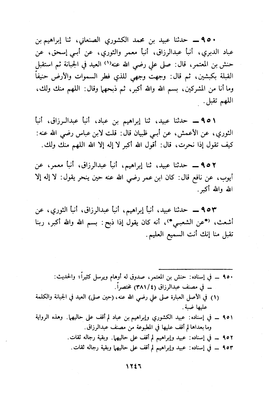 950- حَدَّثَنَا عُبَيْدُ بْنُ مُحَمَّدٍ الْكَشْوَرِيُّ الصَّنْعَانِيُّ، حَدَّثَنَا إِبْرَاهِيمُ بْنُ عَبَّادٍ الدَّبَرِيُّ، أَخْبَرَنَا عَبْدُ الرَّزَّاقِ، أَخْبَرَنَا مَعْمَرٌ، وَالثَّوْرِيُّ، عَنْ أَبِي إِسْحَاقَ، عَنْ حَنَشِ بْنِ الْمُعْتَمِرِ، قَالَ: صَلَّى عَلِيُّ رَضِيَ اللَّهُ عَنْهُ الْعِيدَ فِي الْجَبَّانَةِ, ثُمَّ اسْتَقْبَلَ الْقِبْلَةَ بِكَبْشَيْنِ, ثُمَّ قَالَ: وَجَّهْتُ وَجْهِي لِلَّذِي فَطَرَ السَّمَاوَاتِ وَالأَرْضَ حَنِيفًا, وَمَا أَنَا مِنُ الْمُشْرِكِينَ، بِسْمِ اللهِ، وَاللَّهُ أَكْبَرُ، ثُمَّ ذَبَحَهُمَا, وَقَالَ: اللَّهُمَّ مِنْكَ وَلَكَ, اللَّهُمَّ تَقَبَّلْ.