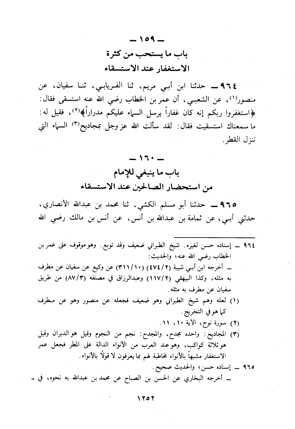 964- حَدَّثَنَا ابْنُ أَبِي مَرْيَمَ، حَدَّثَنَا الْفِرْيَابِيُّ، حَدَّثَنَا سُفْيَانُ، عَنْ مَنْصُورٍ، عَنِ الشَّعْبِيِّ، أَنَّ عُمَرَ بْنَ الْخَطَّابِ، رَضِيَ اللَّهُ عَنْهُ اسْتَسْقَى فَقَالَ: {اسْتَغْفِرُوا رَبَّكُمْ إِنَّهُ كَانَ غَفَّارًا يُرْسِلِ السَّمَاءَ عَلَيْكُمْ مِدْرَارًا} فَقِيلَ لَهُ: مَا سَمِعْنَاكَ اسْتَسْقَيْتَ، فَقَالَ: لَقَدْ سَأَلْتُ اللَّهَ عَزَّ وَجَلَّ بِمَجَادِيحِ السَّمَاءِ الَّتِي تُنْزِلُ الْقَطْرَ.