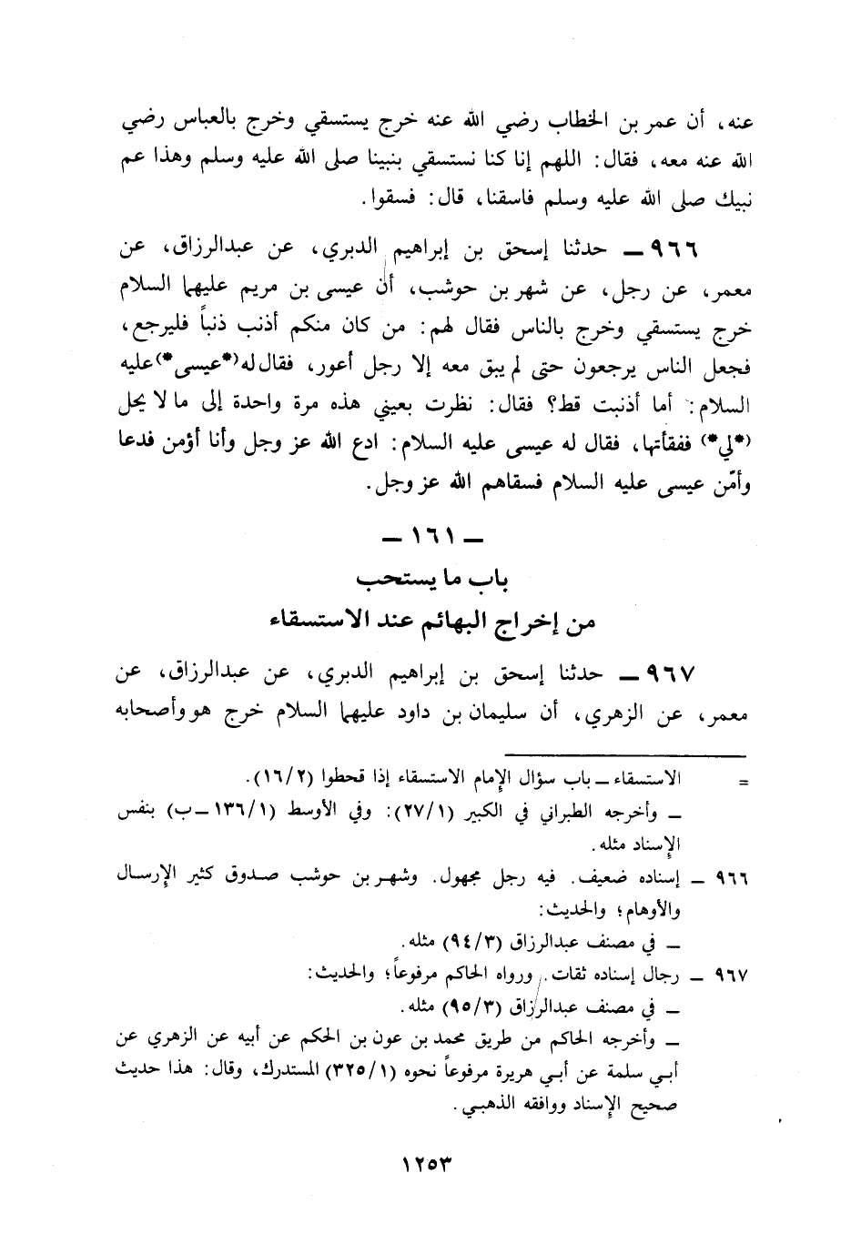 966- حَدَّثَنَا إِسْحَاقُ بْنُ إِبْرَاهِيمَ الدَّبَرِيُّ، عَنْ عَبْدِ الرَّزَّاقِ، عَنْ مَعْمَرٍ، عَنْ رَجُلٍ، عَنْ شَهْرِ بْنِ حَوْشَبٍ, أَنَّ عِيسَى بْنَ مَرْيَمَ، عَلَيْهِمَا السَّلاَمُ خَرَجَ يَسْتَسْقِي, وَخَرَجَ بِالنَّاسِ، فَقَالَ لَهُمْ: مَنْ كَانَ مِنْكُمْ أَذْنَبَ ذَنْبًا, فَلْيَرْجِعْ، فَجَعَلَ النَّاسُ يَرْجِعُونَ, حَتَّى لَمْ يَبْقَ مَعَهُ إِلاَّ رَجُلٌ أَعْوَرُ، فَقَالَ لَهُ عِيسَى عَلَيْهِ السَّلاَمُ: أَمَا أَذْنَبْتَ قَطُّ، فَقَالَ: نَظَرْتُ بِعَيْنَيَّ هَذِهِ مَرَّةً وَاحِدَةً إِلَى مَا لاَ يَحِلُّ لِي, فَفَقَأْتُهَا، فَقَالَ لَهُ عِيسَى عَلَيْهِ السَّلاَمُ: ادْعُ اللَّهَ عَزَّ وَجَلَّ وَأَنَا أُؤَمِّنُ، فَدَعَا وَأَمَّنَ عِيسَى عَلَيْهِ السَّلاَمُ, فَسَقَاهُمُ اللَّهُ عَزَّ وَجَلَّ.