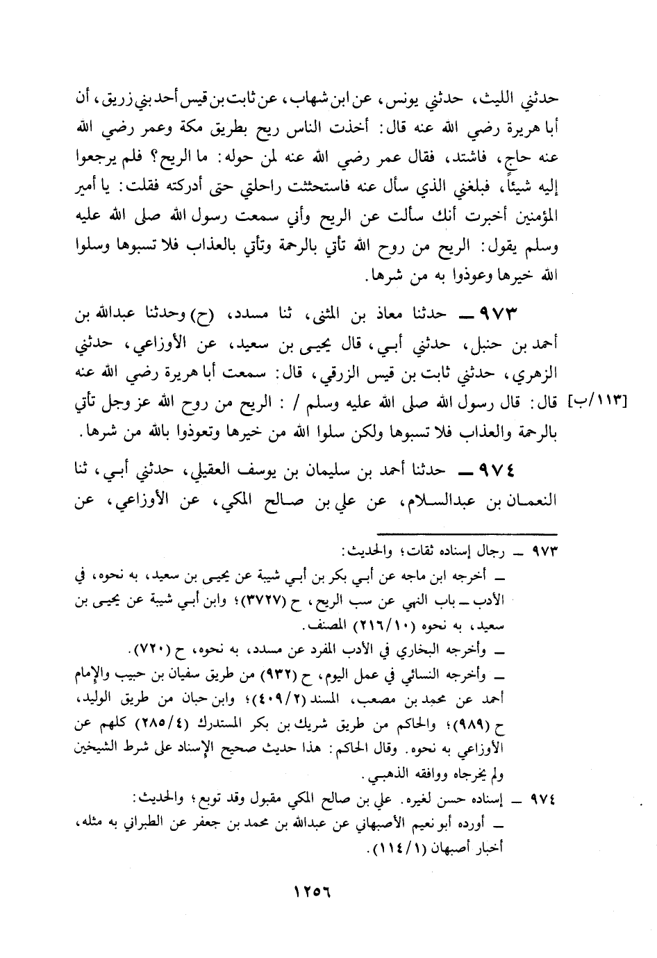 973- حَدَّثَنَا مُعَاذُ بْنُ الْمُثَنَّى، حَدَّثَنَا مُسَدَّدٌ (ح) وَحَدَّثَنَا عَبْدُ اللهِ بْنُ أَحْمَدَ بْنِ حَنْبَلٍ، حَدَّثَنِي أَبِي، قَالَ يَحْيَى بْنُ سَعِيدٍ, عَنِ الأَوْزَاعِيِّ، حَدَّثَنِي الزُّهْرِيُّ، حَدَّثَنِي ثَابِتُ بْنُ قَيْسٍ الزُّرَقِيُّ، قَالَ: سَمِعْتُ أَبَا هُرَيْرَةَ، رَضِيَ اللَّهُ عَنْهُ قَالَ: قَالَ رَسُولُ اللهِ صَلى الله عَلَيه وَسَلم: الرِّيحُ مِنْ رَوْحِ اللهِ عَزَّ وَجَلَّ, تَأْتِي بِالرَّحْمَةِ وَالْعَذَابِ، فَلاَ تَسُبُّوهَا, وَلَكِنْ سَلُوا اللَّهَ مِنْ خَيْرِهَا، وَتَعَوَّذُوا بِاللهِ مِنْ شَرِّهَا.
