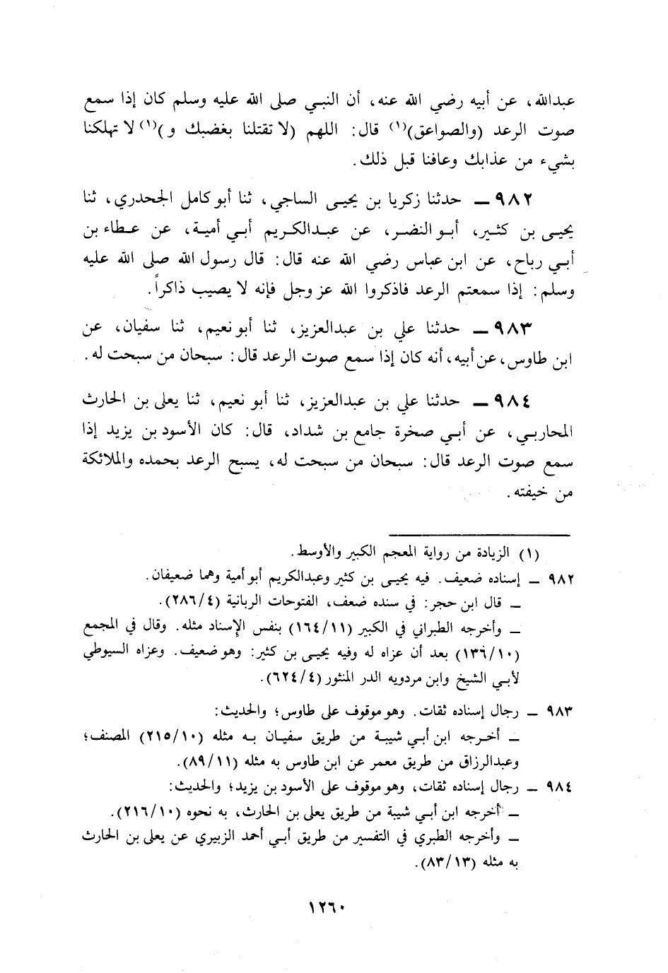 983- حَدَّثَنَا عَلِيُّ بْنُ عَبْدِ الْعَزِيزِ، حَدَّثَنَا أَبُو نُعَيْمٍ، حَدَّثَنَا سُفْيَانُ، عَنِ ابْنِ طَاوُوسٍ، عَنْ أَبِيهِ، أَنَّهُ كَانَ إِذَا سَمِعَ صَوْتَ الرَّعْدِ، قَالَ: سُبْحَانَ مَنْ سَبَّحْتَ لَهُ.