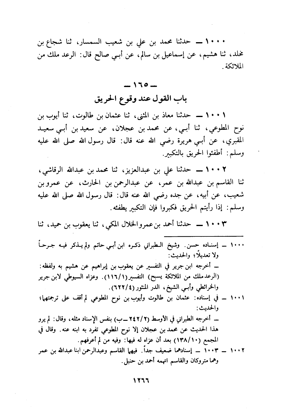 1000- حَدَّثَنَا مُحَمَّدُ بْنُ عَلِيِّ بْنِ شُعَيْبٍ السِّمْسَارُ، حَدَّثَنَا شُجَاعُ بْنُ مَخْلَدٍ، حَدَّثَنَا هُشَيْمٌ، عَنْ إِسْمَاعِيلَ بْنِ سَالِمٍ، عَنْ أَبِي صَالِحٍ، قَالَ: الرَّعْدُ مَلَكٌ مِنَ الْمَلاَئِكَةِ.