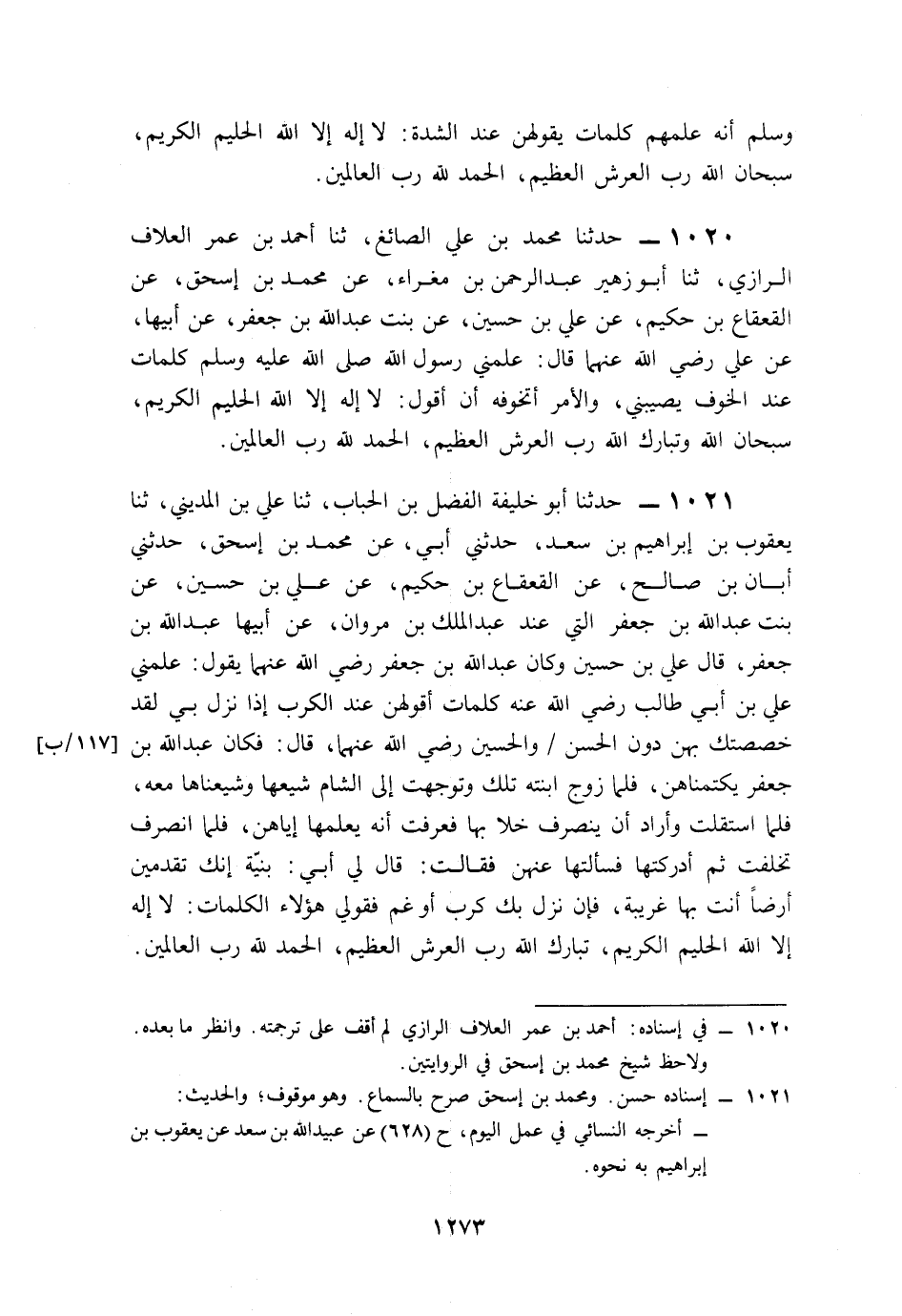 1020- حَدَّثَنَا مُحَمَّدُ بْنُ عَلِيٍّ الصَّائِغُ، حَدَّثَنَا أَحْمَدُ بْنُ عُمَرَ الْعَلاَّفُ الرَّازِيُّ، حَدَّثَنَا أَبُو زُهَيْرٍ عَبْدُ الرَّحْمَنِ بْنُ مَغْرَاءَ، عَنْ مُحَمَّدِ بْنِ إِسْحَاقَ، عَنِ الْقَعْقَاعِ بْنِ حَكِيمٍ، عَنْ عَلِيِّ بْنِ حُسَيْنٍ، عَنْ بِنْتِ عَبْدِ اللهِ بْنِ جَعْفَرٍ، عَنْ أَبِيهَا، عَنْ عَلِيٍّ، رَضِيَ اللَّهُ عَنْهُمَا قَالَ: عَلَّمَنِي رَسُولُ اللهِ صَلى الله عَلَيه وَسَلم كَلِمَاتٍ عِنْدَ الْخَوْفِ يُصِيبُنِي وَالأَمْرُ أَتَخَوَّفُهُ, أَنْ أَقُولَ: لاَ إِلَهَ إِلاَّ اللَّهُ الْحَلِيمُ الْكَرِيمُ، سُبْحَانَ اللهِ وَتَبَارَكَ اللَّهُ رَبُّ الْعَرْشِ الْعَظِيمِ، الْحَمْدُ لِلَّهِ رَبِّ الْعَالَمِينَ.