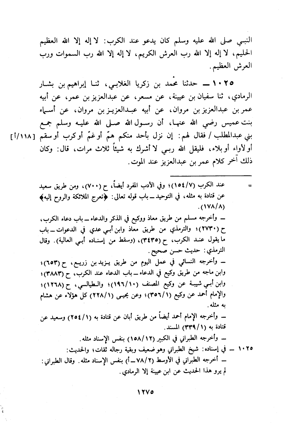 1025- حَدَّثَنَا مُحَمَّدُ بْنُ زَكَرِيَّا الْغَلاَبِيُّ، حَدَّثَنَا إِبْرَاهِيمُ بْنُ بَشَّارٍ الرَّمَادِيُّ، حَدَّثَنَا سُفْيَانُ بْنُ عُيَيْنَةَ، عَنْ مِسْعَرٍ، عَنْ عَبْدِ الْعَزِيزِ بْنِ عُمَرَ، عَنْ أَبِيهِ عُمَرَ بْنِ عَبْدِ الْعَزِيزِ بْنِ مَرْوَانَ, عَنْ أَبِيهِ عَبْدِ الْعَزِيزِ بْنِ مَرْوَانَ، عَنْ أَسْمَاءَ بِنْتِ عُمَيْسٍ، رَضِيَ اللَّهُ عَنْهَا, أَنَّ رَسُولَ اللهِ صَلى الله عَلَيه وَسَلم جَمَعَ بَنِي عَبْدِ الْمُطَّلِبِ, فَقَالَ لَهُمْ: إِنْ نَزَلَ بِأَحَدٍ مِنْكُمْ هَمٌّ, أَوْ غَمٌّ, أَوْ كَرْبٌ, أَوْ سَقَمٌ, أَوْ لَأْوَاءُ, أَوْ بَلاَءٌ فَلْيَقُلِ: اللَّهُ رَبِّي لاَ أُشْرِكُ بِهِ شَيْئًا ثَلاَثَ مَرَّاتٍ, قَالَ: وَكَانَ ذَلِكَ آخِرَ كَلاَمِ عُمَرَ بْنِ عَبْدِ الْعَزِيزِ عِنْدَ الْمَوْتِ.