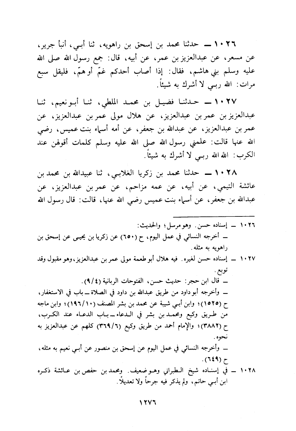 1026- حَدَّثَنَا مُحَمَّدُ بْنُ إِسْحَاقِ بْنِ رَاهَوَيْهِ، حَدَّثَنَا أَبِي، أَخْبَرَنَا جَرِيرٌ، عَنْ مِسْعَرٍ، عَنْ عَبْدِ الْعَزِيزِ بْنِ عُمَرَ، عَنْ أَبِيهِ، قَالَ: جَمَعَ رَسُولُ اللهِ صَلى الله عَلَيه وَسَلم بَنِي هَاشِمٍ فَقَالَ: إِذَا أَصَابَ أَحَدَكُمْ غَمٌّ, أَوْ هَمٌّ, فَلْيَقُلْ سَبْعَ مَرَّاتٍ: اللَّهُ رَبِّي لاَ أُشْرِكُ بِهِ شَيْئًا.