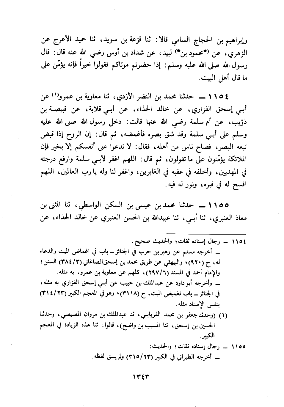 1154- حَدَّثَنَا مُحَمَّدُ بْنُ النَّضْرِ الأَزْدِيُّ، حَدَّثَنَا مُعَاوِيَةُ بْنُ عَمْرٍو، عَنْ أَبِي إِسْحَاقَ الْفَزَارِيِّ، عَنْ خَالِدٍ الْحَذَّاءِ، عَنْ أَبِي قِلاَبَةَ، عَنْ قَبِيصَةَ بْنِ ذُؤَيْبٍ، عَنْ أُمِّ سَلَمَةَ، رَضِيَ اللَّهُ عَنْهَا قَالَتْ: دَخَلَ رَسُولُ اللهِ صَلى الله عَلَيه وَسَلم عَلَى أَبِي سَلَمَةَ وَقَدْ شَقَّ بَصَرَهُ فَأَغْمَضَهُ، ثُمَّ قَالَ: إِنَّ الرُّوحَ إِذَا قُبِضَ تَبِعَهُ الْبَصَرُ, فَصَاحَ نَاسٌ مِنْ أَهْلِهِ, فَقَالَ: لاَ تَدْعُوا عَلَى أَنْفُسِكُمْ إِلاَّ بِخَيْرٍ, فَإِنَّ الْمَلاَئِكَةَ يُؤَمِّنُونَ عَلَى مَا تَقُولُونَ, ثُمَّ قَالَ: اللَّهُمَّ اغْفِرْ لِأَبِي سَلَمَةَ، وَارْفَعْ دَرَجَتَهُ فِي الْمَهْدِيِّينَ، وَاخْلُفْهُ فِي عَقِبِهِ فِي الْغَابِرِينَ، وَاغْفِرْ لَنَا وَلَهُ يَا رَبَّ الْعَالَمِينَ، اللَّهُمَّ أَفْسِحْ لَهُ فِي قَبْرِهِ, وَنَوِّرْ لَهُ فِيهِ.