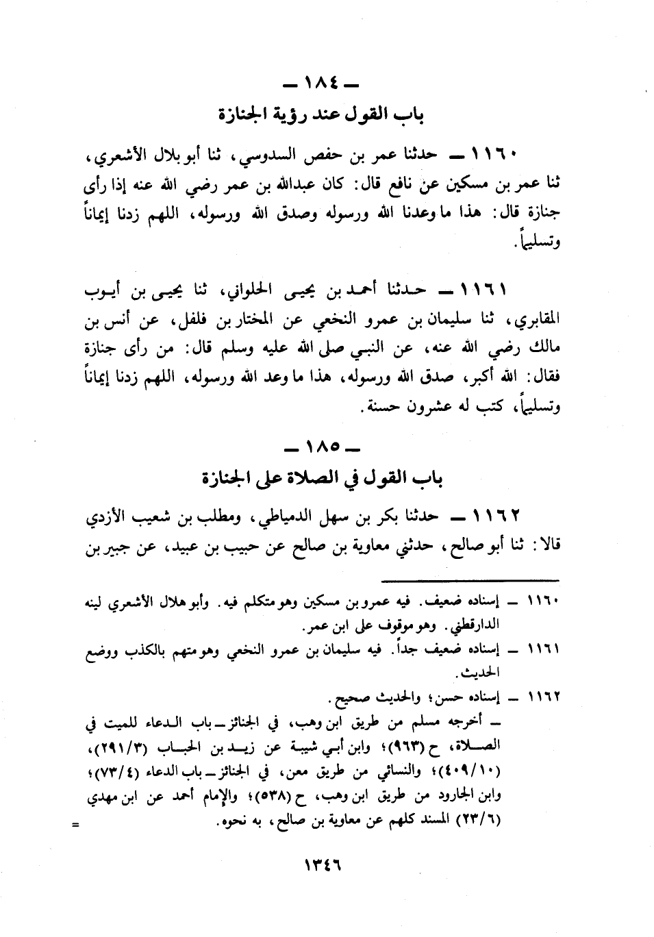 1161- حَدَّثَنَا أَحْمَدُ بْنُ يَحْيَى الْحُلْوَانِيُّ، حَدَّثَنَا يَحْيَى بْنُ أَيُّوبَ الْمَقَابِرِيُّ، حَدَّثَنَا سُلَيْمَانُ بْنُ عَمْرٍو النَّخَعِيُّ، عَنِ الْمُخْتَارِ بْنِ فُلْفُلٍ، عَنْ أَنَسِ بْنِ مَالِكٍ، رَضِيَ اللَّهُ عَنْهُ, عَنِ النَّبِيِّ صَلى الله عَلَيه وَسَلم قَالَ: مَنْ رَأَى جَنَازَةً فَقَالَ: اللَّهُ أَكْبَرُ صَدَقَ اللَّهُ وَرَسُولُهُ، هَذَا مَا وَعَدَ اللَّهُ وَرَسُولُهُ، اللَّهُمَّ زِدْنَا إِيمَانًا وَتَسْلِيمًا، كُتِبَ لَهُ عِشْرُونَ حَسَنَةً.