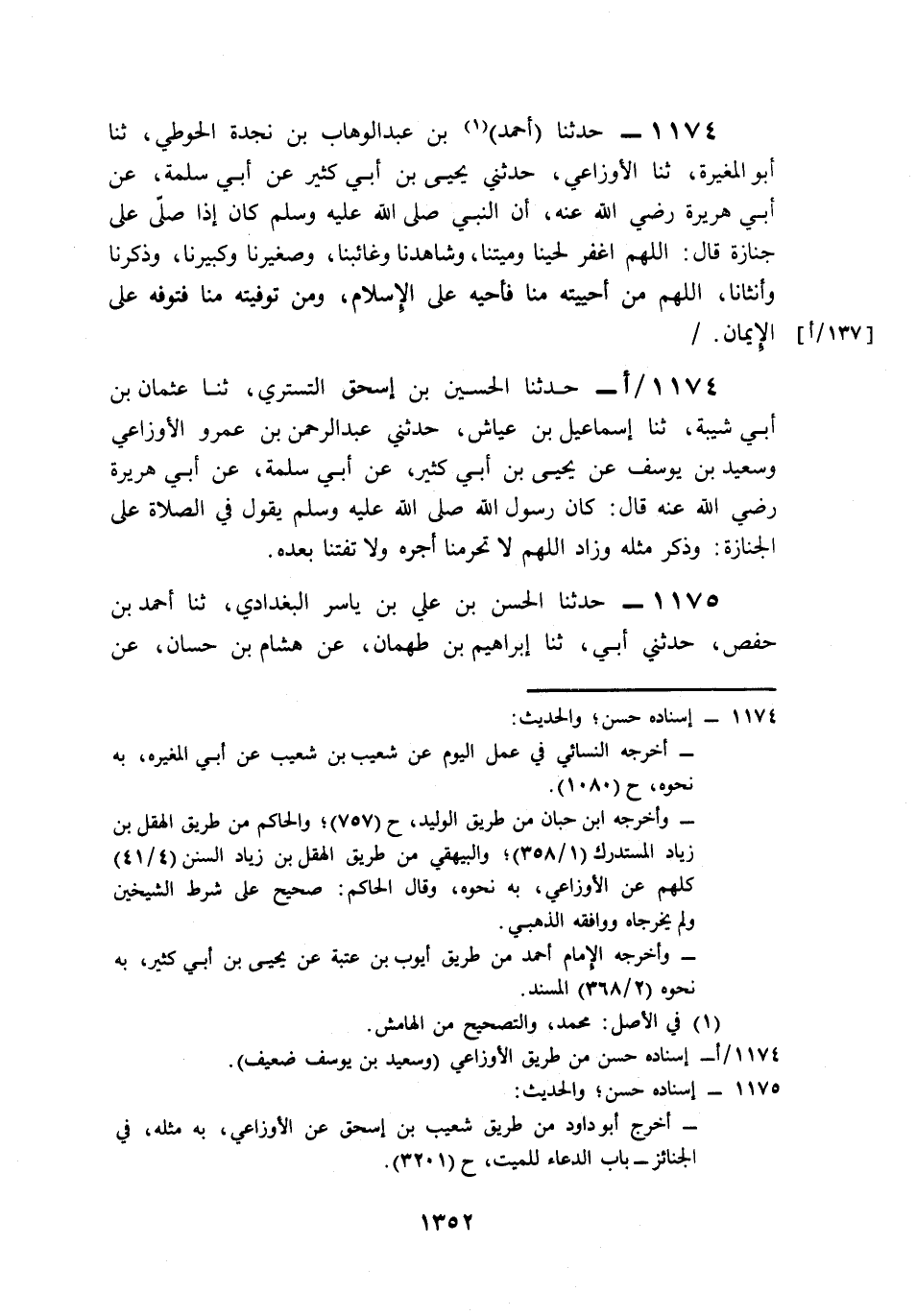 1174م- حَدَّثَنَا الْحُسَيْنُ بْنُ إِسْحَاقَ التُّسْتَرِيُّ، حَدَّثَنَا عُثْمَانُ بْنُ أَبِي شَيْبَةَ، حَدَّثَنَا إِسْمَاعِيلُ بْنُ عَيَّاشٍ، حَدَّثَنِي عَبْدُ الرَّحْمَنِ بْنُ عَمْرٍو الأَوْزَاعِيُّ، وَسَعِيدُ بْنُ يُوسُفَ، عَنْ يَحْيَى بْنِ أَبِي كَثِيرٍ، عَنْ أَبِي سَلَمَةَ، عَنْ أَبِي هُرَيْرَةَ، رَضِيَ اللَّهُ عَنْهُ قَالَ: كَانَ رَسُولُ اللهِ صَلى الله عَلَيه وَسَلم يَقُولُ فِي الصَّلاَةِ عَلَى الْجَنَازَةِ: وَذَكَرَ مِثْلَهُ، وَزَادَ: اللَّهُمَّ لاَ تَحْرِمْنَا أَجْرَهُ، وَلاَ تَفْتِنَّا بَعْدَهُ.