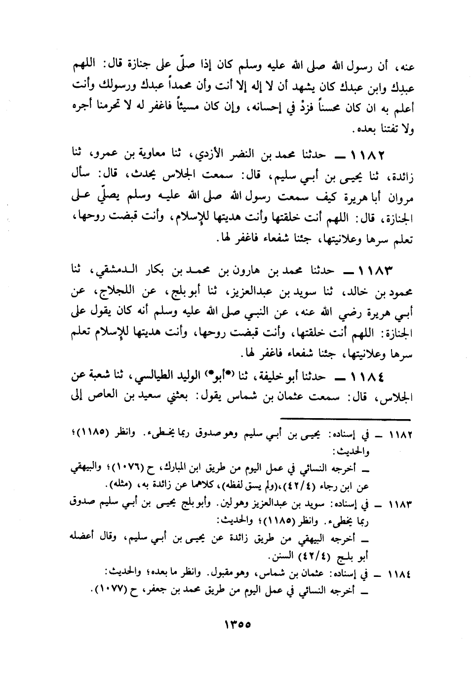 1182- حَدَّثَنَا مُحَمَّدُ بْنُ النَّضْرِ الأَزْدِيُّ، حَدَّثَنَا مُعَاوِيَةُ بْنُ عَمْرٍو، حَدَّثَنَا زَائِدَةُ، حَدَّثَنَا يَحْيَى بْنُ أَبِي سُلَيْمٍ، قَالَ: سَمِعْتُ الْجُلاَسَ يُحَدِّثُ قَالَ: سَأَلَ مَرْوَانُ أَبَا هُرَيْرَةَ: كَيْفَ سَمِعْتَ رَسُولَ اللهِ صَلى الله عَلَيه وَسَلم يُصَلِّي عَلَى الْجَنَازَةِ؟ قَالَ: اللَّهُمَّ أَنْتَ خَلَقْتَهَا، وَأَنْتَ هَدَيْتَهَا لِلإِسْلاَمِ، وَأَنْتَ قَبَضْتَ رُوحَهَا، تَعْلَمُ سِرَّهَا وَعَلاَنِيَتَهَا، جِئْنَا شُفَعَاءَ فَاغْفِرْ لَهَا.