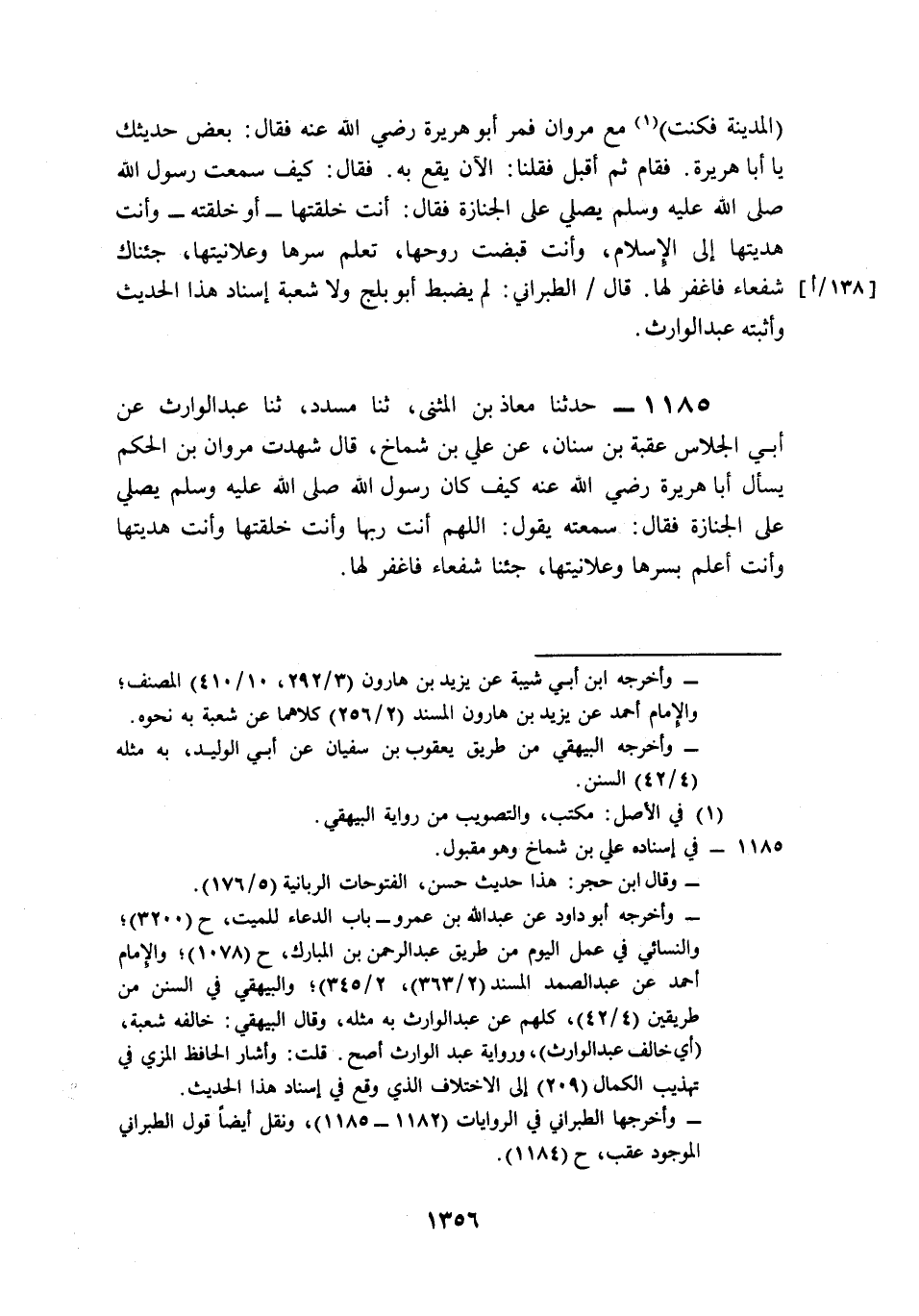 1185- حَدَّثَنَا مُعَاذُ بْنُ الْمُثَنَّى، حَدَّثَنَا مُسَدَّدٌ، حَدَّثَنَا عَبْدُ الْوَارِثِ، عَنْ أَبِي الْجُلاَسِ عُقْبَةَ بْنِ سِنَانٍ، عَنْ عَلِيِّ بْنِ شَمَّاخٍ، قَالَ: شَهِدْتُ مَرْوَانَ بْنَ الْحَكَمِ يَسْأَلُ أَبَا هُرَيْرَةَ رَضِيَ اللَّهُ عَنْهُ: كَيْفَ كَانَ رَسُولُ اللهِ صَلى الله عَلَيه وَسَلم يُصَلِّي عَلَى الْجَنَازَةِ، فَقَالَ: سَمِعْتُهُ يَقُولُ: اللَّهُمَّ أَنْتَ رَبُّهَا، وَأَنْتَ خَلَقْتَهَا، وَأَنْتَ هَدَيْتَهَا، وَأَنْتَ أَعْلَمُ بِسِرِّهَا وَعَلاَنِيَتِهَا، جِئْنَا شُفَعَاءَ فَاغْفِرْ لَهَا.