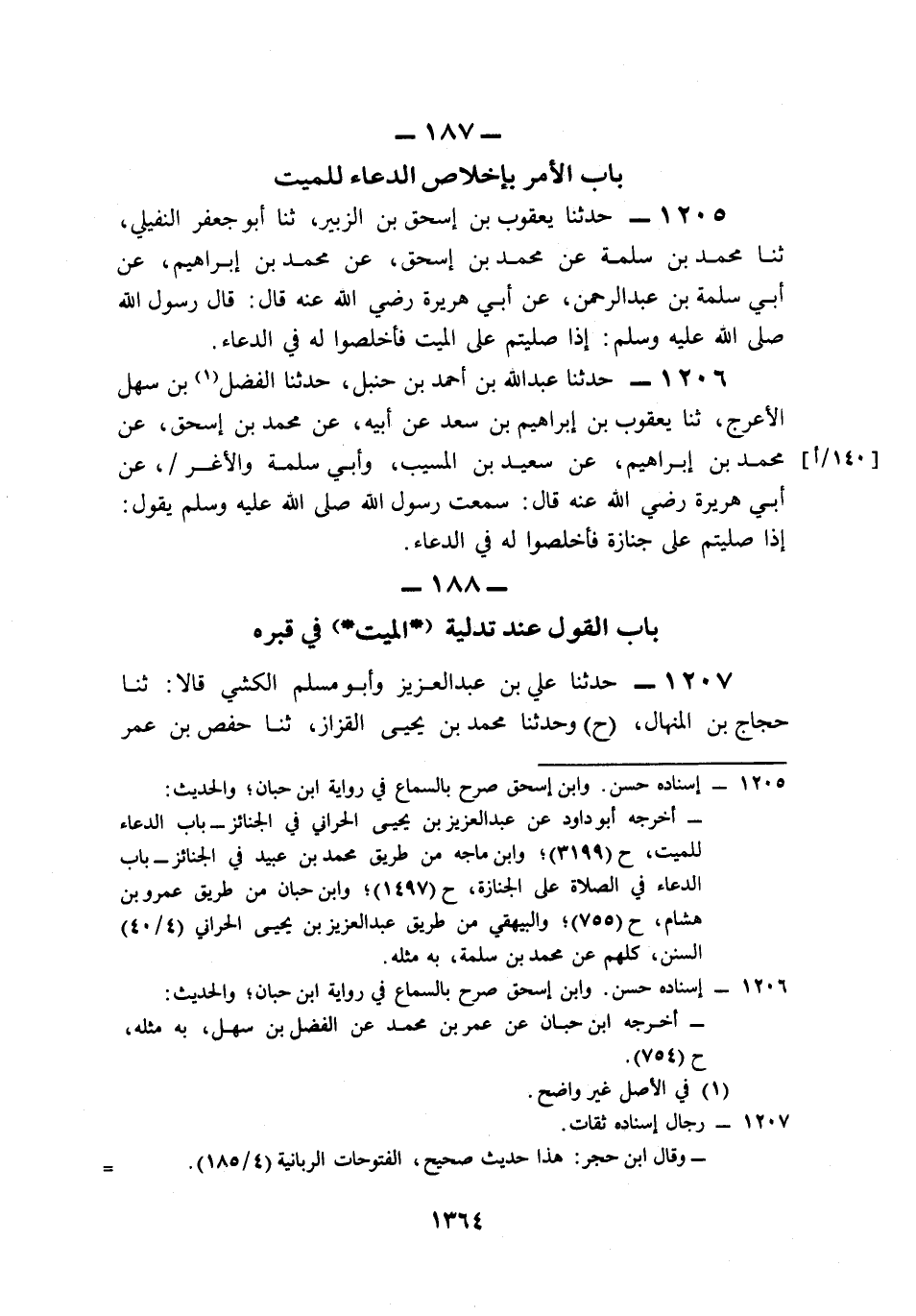 1205- حَدَّثَنَا يَعْقُوبُ بْنُ إِسْحَاقَ بْنِ الزُّبَيْرِ، حَدَّثَنَا أَبُو جَعْفَرٍ النُّفَيْلِيُّ، حَدَّثَنَا مُحَمَّدُ بْنُ سَلَمَةَ، عَنْ مُحَمَّدِ بْنِ إِسْحَاقَ، عَنْ مُحَمَّدِ بْنِ إِبْرَاهِيمَ، عَنْ أَبِي سَلَمَةَ بْنِ عَبْدِ الرَّحْمَنِ، عَنْ أَبِي هُرَيْرَةَ، رَضِيَ اللَّهُ عَنْهُ قَالَ: قَالَ رَسُولُ اللهِ صَلى الله عَلَيه وَسَلم: إِذَا صَلَّيْتُمْ عَلَى الْمَيِّتِ, فَأَخْلِصُوا لَهُ فِي الدُّعَاءِ.